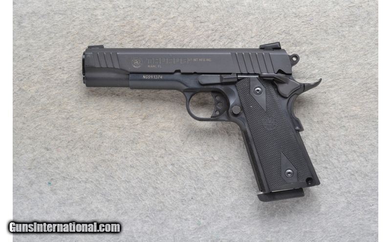 Description: This Taurus Model PT 1911 is a right hand semi-auto pistol in .45 ACP Cal. It has a 5 inch barrel with a front and rear serrated slide. A blade front and notch rear sight with 3 white sight dots. The grip panels are a diamond checkered black rubber. It has an adjustable, grooved 3 hole trigger and a ringed serrated hammer. .45 ACP SOLD Chambers: Semi-Auto 8 round magazine. Metal Condition: Very good. Minor handling marks and wear spots. Bore Condition: Very good. Barrels: 5 inch barrel with a front and rear serrated slide. Triggers: Adjustable. Grooved. 3 hole. Weight: 40 Oz. Sights: Blade front. Notch rear. 3 white sight dots. Item Location: Richfield, WI |