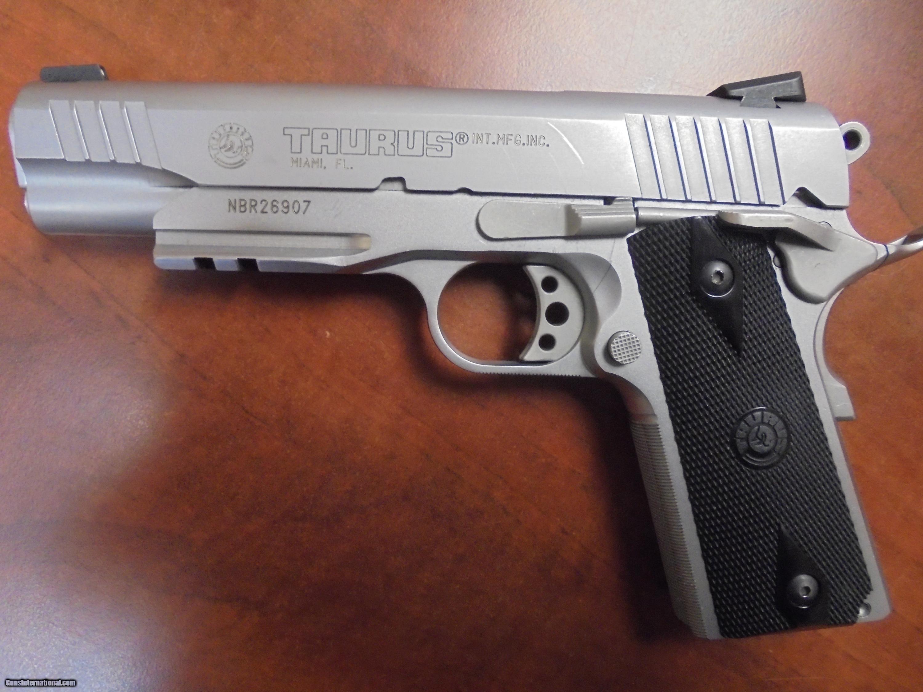 Description: USED VERY GOOD CONDITION TAURUS PT 1911 45ACP SS WITH RAIL 8 SHOT HAS FACTORY CASE AND 2 8RND MAGS PRICE REFLECTS PAYMENT BY MONEY ORDER / CASHIERS CHECK. A 3% PREMIUM IS ADDED FOR CREDIT CARDS ****PLEASE CALL IN THE WITH THE LISTER INVENTORY NUMBER**** WE DO NOT SHIP FIREARMS AND/OR FIREARMS’ PARTS OUT OF THE 50 UNITED STATES, SO DON’T ASK PRICE REFLECTS PAYMENT BY MONEY ORDER / CASHIERS CHECK. A 3% PREMIUM IS ADDED FOR CREDIT CARDS. WE DO OFFER A LAYAWAY PLAN. YOU CAN LAYAWAY FOR 30, 60, OR 90 DAYS. THERE IS A $5.00 CHARGE FOR EVERY 30 DAYS ITEM IS ON LAYAWAY. WE ALSO REQUIRE A 20% DOWN PAYMENT ON LAYAWAY ITEM. LAYAWAYS ARE NON REFUNDABLE. HERE IS HOW THIS PROCESS WORKS. YOU WOULD CALL US AT 540-337-9218 WITH LISTER # TO PURCHASE THE GUN. THEN ONCE I HAVE RECEIVED PAYMENT AND AN FFL (FEDERAL FIREARMS LICENSE) FROM A LICENSED DEALER IN YOUR AREA OF YOUR CHOICE. WE WILL THEN SHIP THE GUN TO THEM. YOU WOULD THEN PICK UP THE GUN AT YOUR LOCAL DEALER AND DO PAPER WORK THERE. DOMINION OUTDOORS 15 ANGELA COURT FISHERSVILLE ,VA 22939 540-337-9218 540-337-2422 fax ****PLEASE CALL IN THE WITH THE LISTER INVENTORY NUMBER**** ***PLANO HARD CASES AVAIABLE FOR PURCHASE $18.99 WITH THE PURCHASE OF A FIREARM.** SOLD |