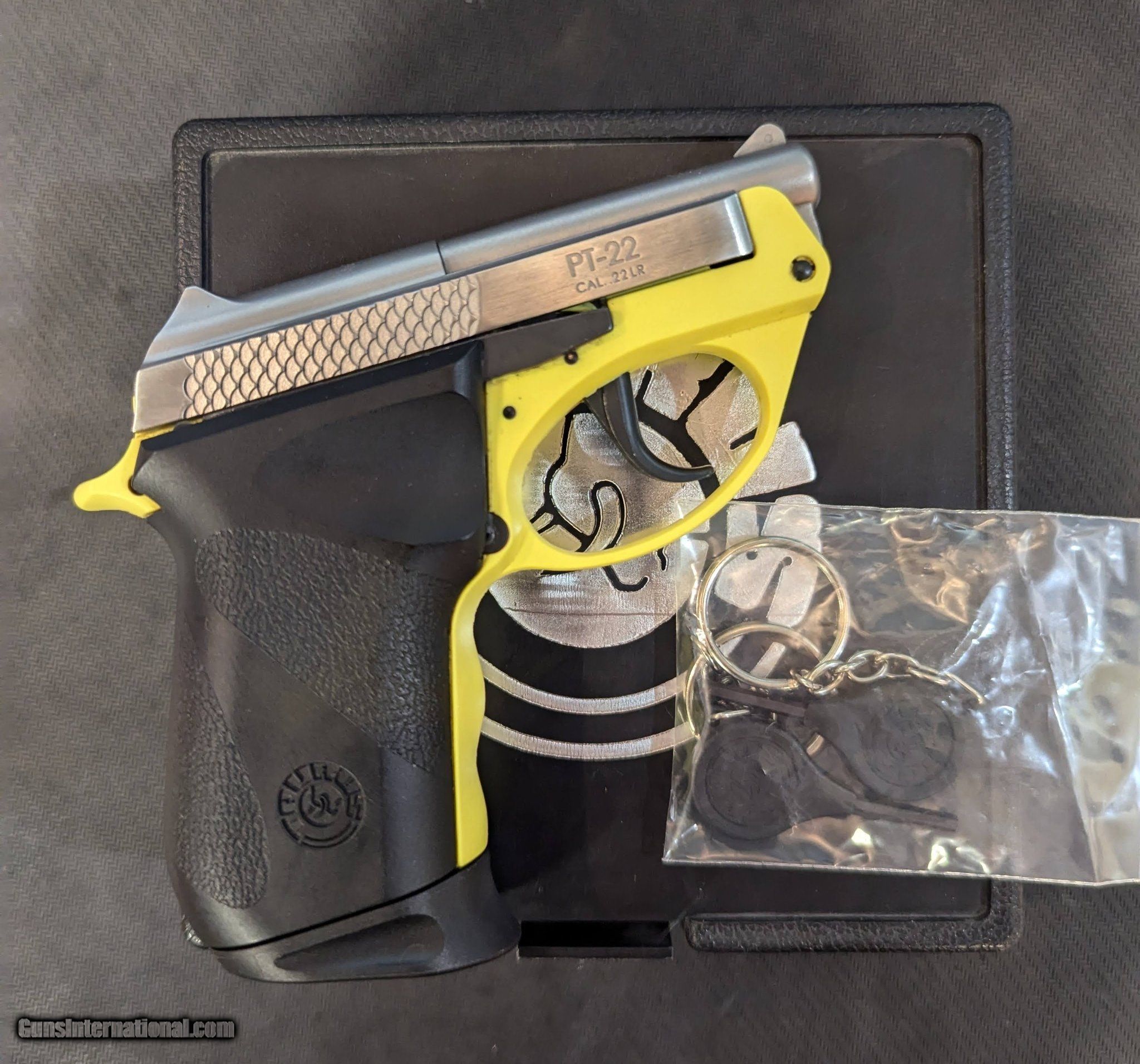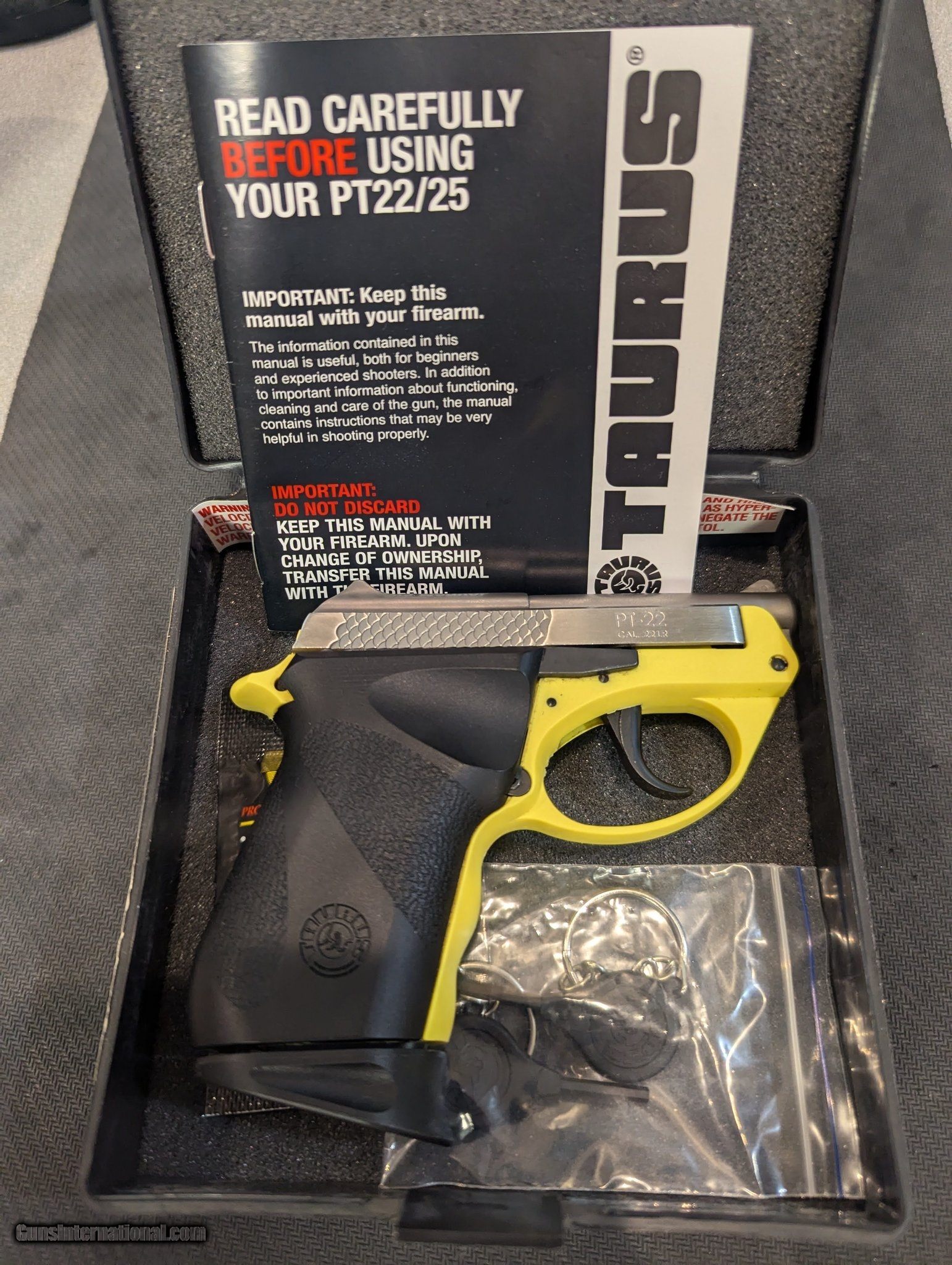 Description: Guns Listing ID: 1400883 THIS LITTLE GUY IS IN GREAT CONDITION. PERFECT POCKET PISTOL. AMAZING PRICE. HAS ORIGINAL BOX, PAPERWORK AND KEYS. ONLY 1 MAGAZINE. Taurus 1220039PLYF M22 .22 LR Stainless YLLW FRM - 8+1 Rounds, 2.33\" Barrel, Polymer Grips, 3-Dot Sights TAURUS INTERNATIONAL M22 w/Yellow Polymer Frame Taurus Model 22 Double Action Only with Yellow Polymer Frame. It offers a small yet powerful package taking advantage of the .22 LR cartridge - one of the most popular and affordable cartridges in production today.This petite pistol packs a wallop, and all enjoy the extra convenience and peace of mind the Taurus tip up barrel provides. SPECIFICATIONS: Mfg Item Num: 122039PLYF Category: FIREARMS - HANDGUNS Type :Pistol Action :Double Action Caliber :22 Long Rifle Barrel Length :2.33 in Capacity :8 + 1 Safety :Manual Grips :Polymer Sights :Fixed Weight :10.8 oz Finish :Stainless/Yellow SOLD Manufacturer: TAURUS Model: PT-22 Caliber Info: .22 LR Condition: Used - Non-Certified Barrels: 2.25 BARREL Finish: YELLOW AND BLACK |