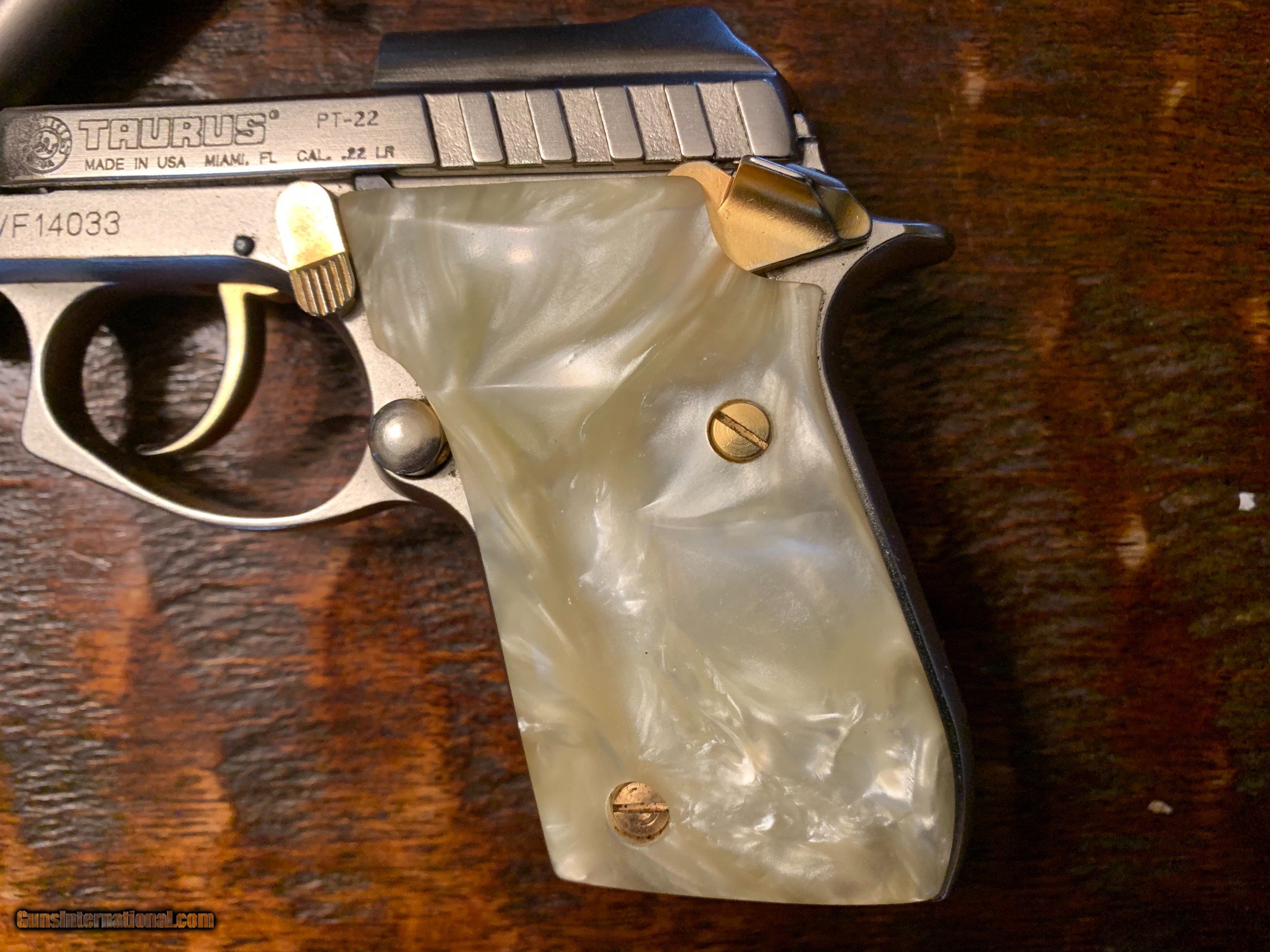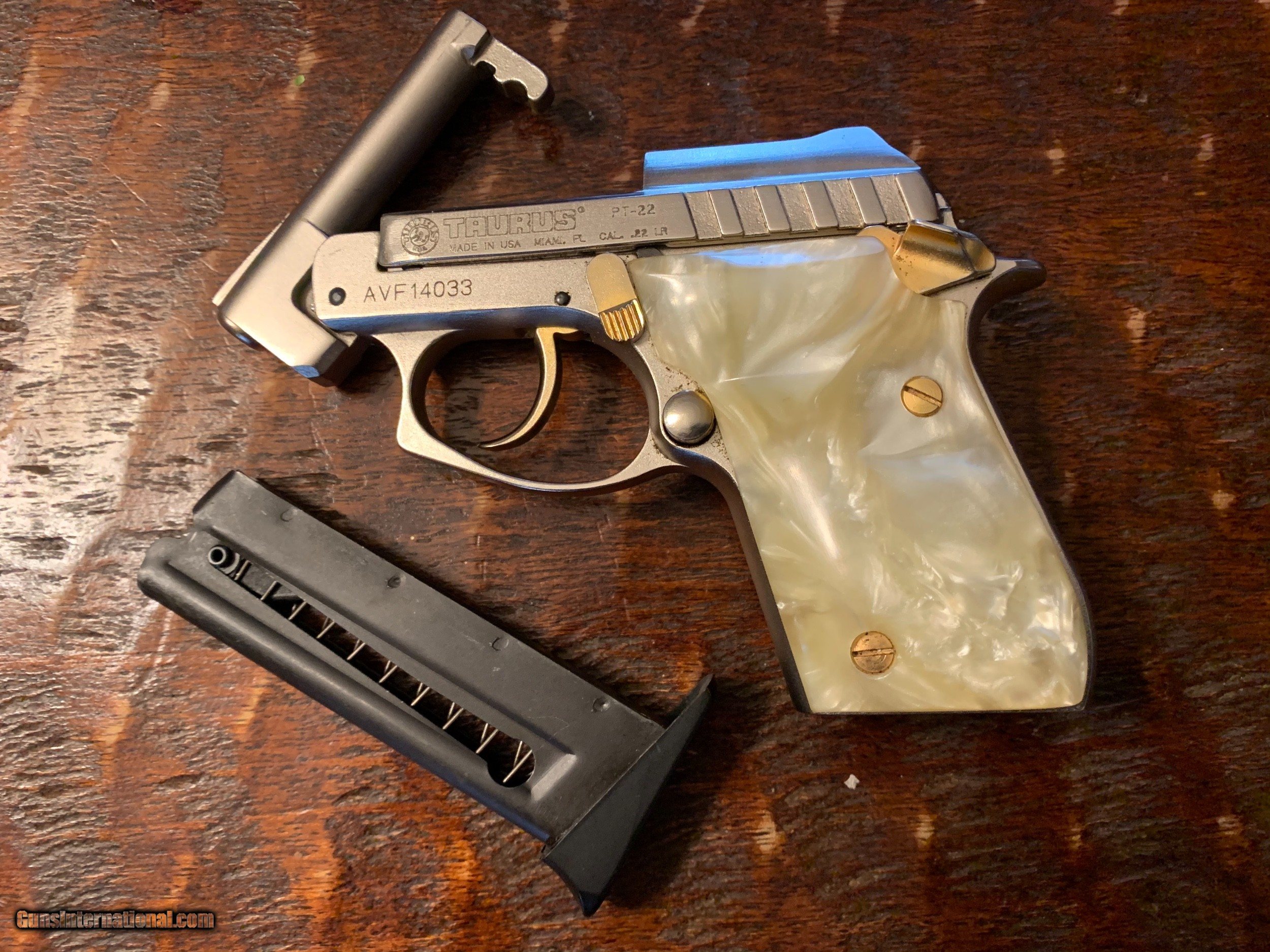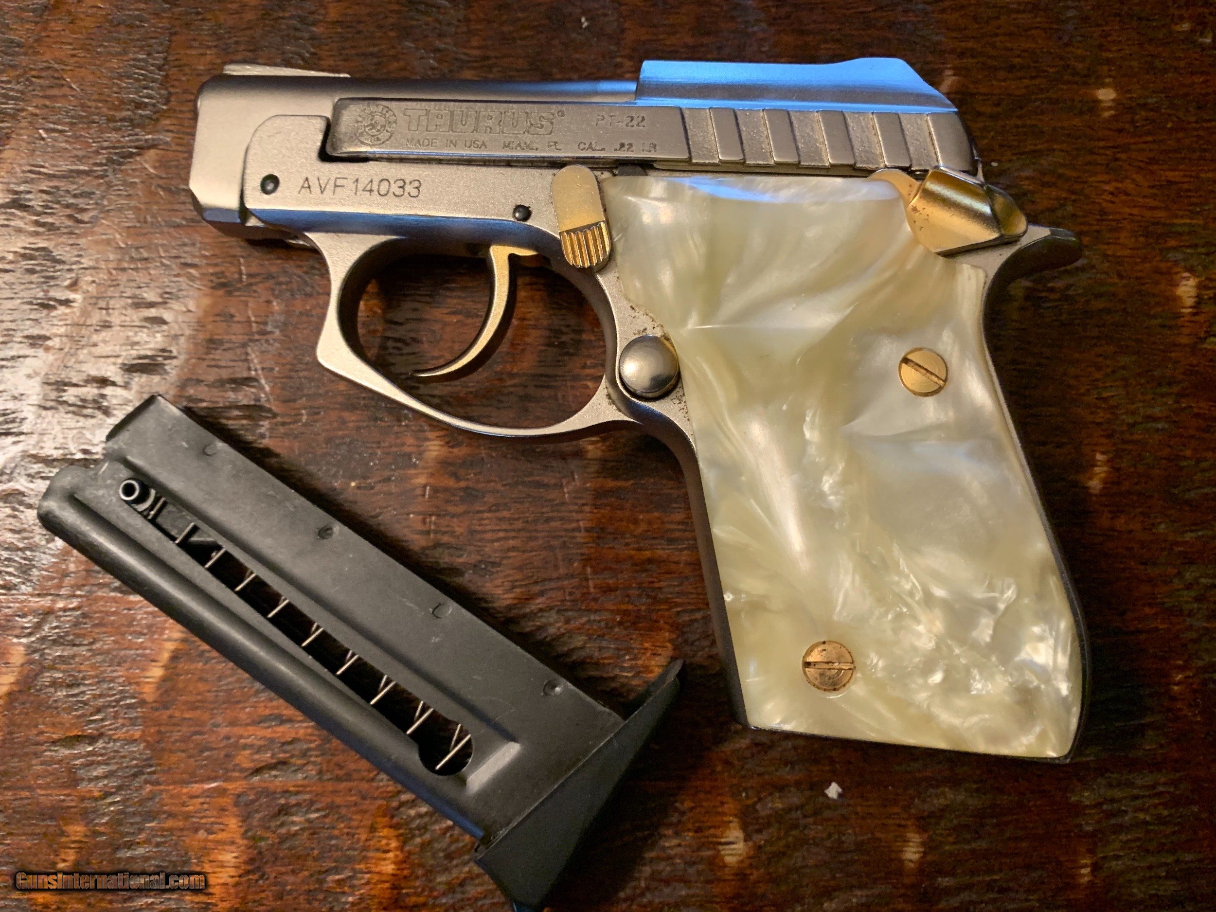 Description: SOLD: Taurus PT 22LR SemiAuto "tip-up" Pistol. Pearl grips, 2 3/4" barrel with one (1) 8 round magazine. Nickel frame with gold plate trigger/barrel release/grip screws. Tip-up design allows pistol to be chambered without racking the slide. Slide by design is very stiff. Excellent condition 95%. Metal +95% and pearl grips 90% with hairline crack in right grip at gold screw. SOLD Handgun Caliber: .22 Long Rifle Manufacturer: Taurus - Florida, USA Model: PT 22 Serial Number: AVF1xxxx Barrel Length: 2 3/4” Condition: Excellent Metal Condition: 95% Wood Condition: Grip mother of pearl 90% (hairline crack) Bore Condition: Shiny Barrel Type: Tip-up break action Action: SemiAuto Triggers: Gold plate Manufacture Date: 2003 Extras: Pearl grips, nickel and gold frame and trigger. Item Location: Oregon |