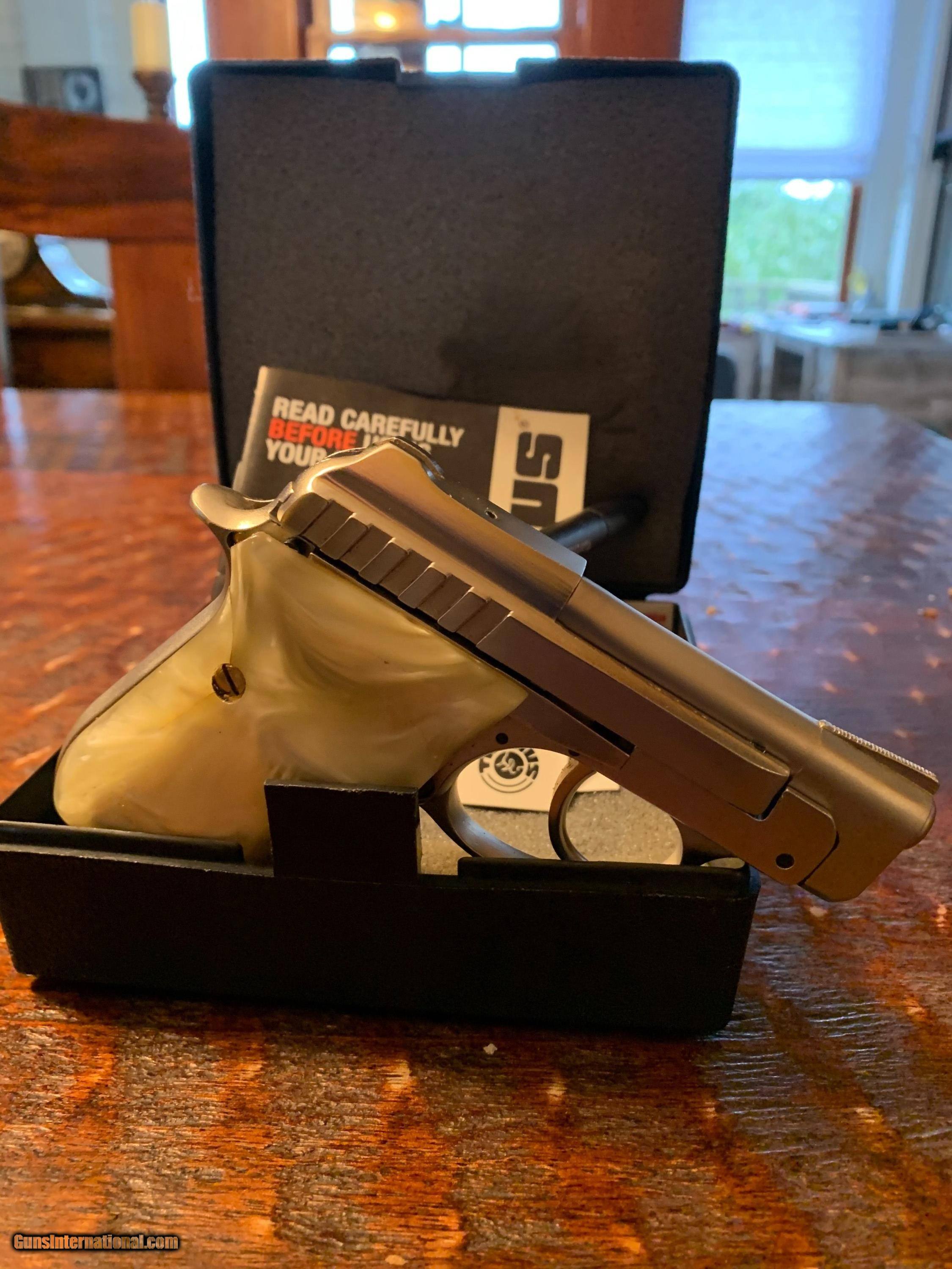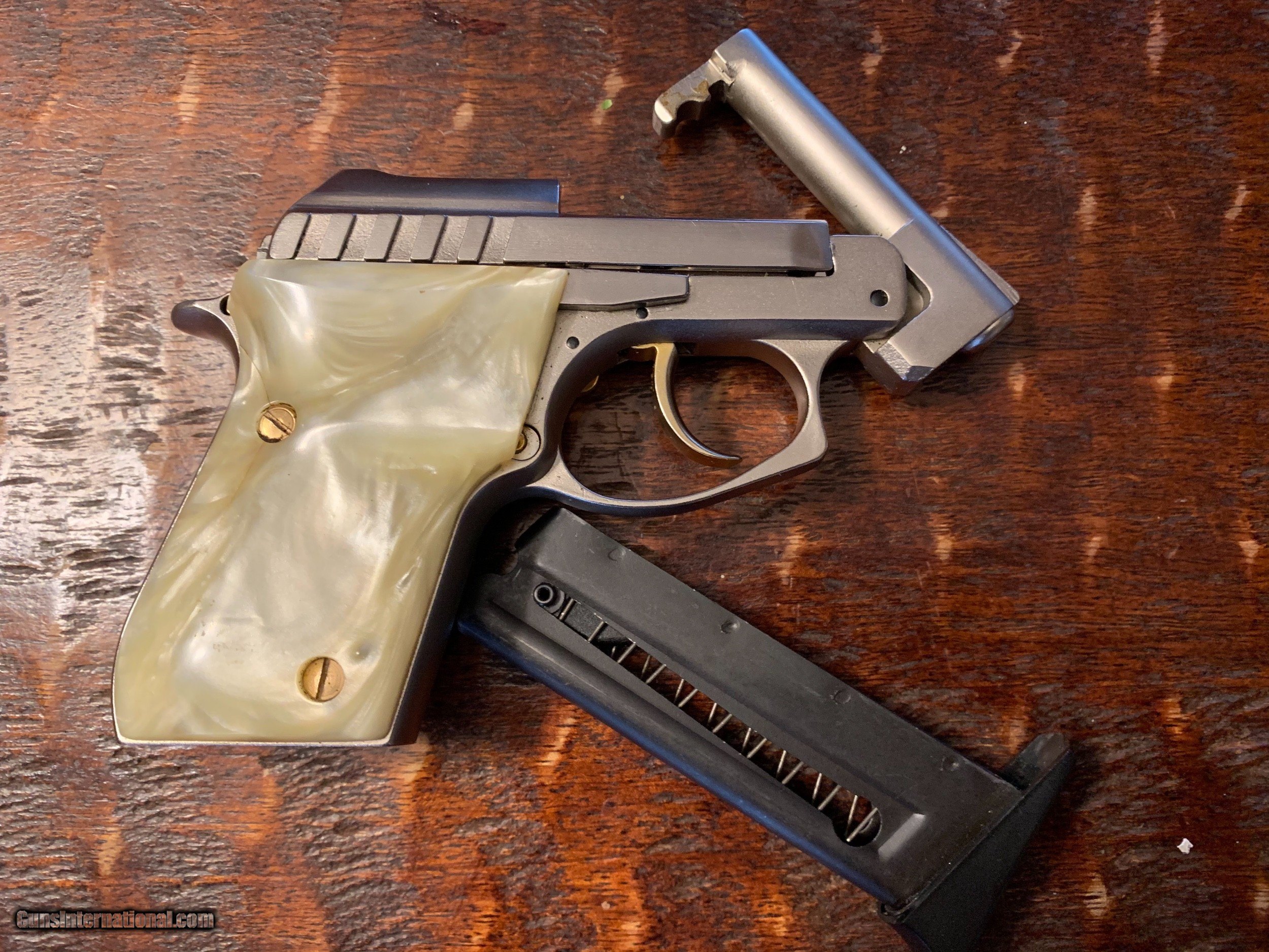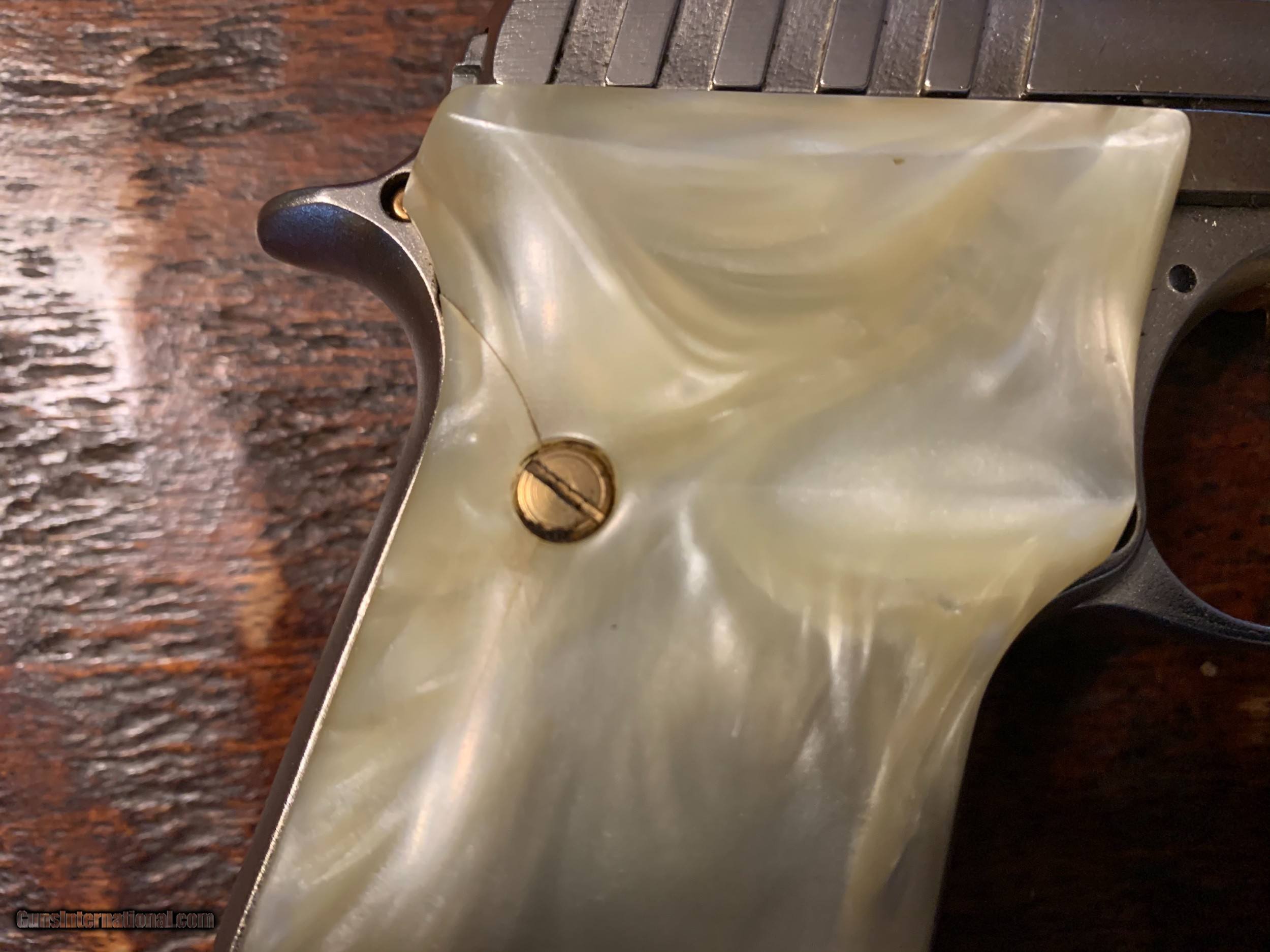 Description: SOLD: Taurus PT 22LR SemiAuto "tip-up" Pistol. Pearl grips, 2 3/4" barrel with one (1) 8 round magazine. Nickel frame with gold plate trigger/barrel release/grip screws. Tip-up design allows pistol to be chambered without racking the slide. Slide by design is very stiff. Excellent condition 95%. Metal +95% and pearl grips 90% with hairline crack in right grip at gold screw. SOLD Handgun Caliber: .22 Long Rifle Manufacturer: Taurus - Florida, USA Model: PT 22 Serial Number: AVF1xxxx Barrel Length: 2 3/4” Condition: Excellent Metal Condition: 95% Wood Condition: Grip mother of pearl 90% (hairline crack) Bore Condition: Shiny Barrel Type: Tip-up break action Action: SemiAuto Triggers: Gold plate Manufacture Date: 2003 Extras: Pearl grips, nickel and gold frame and trigger. Item Location: Oregon |