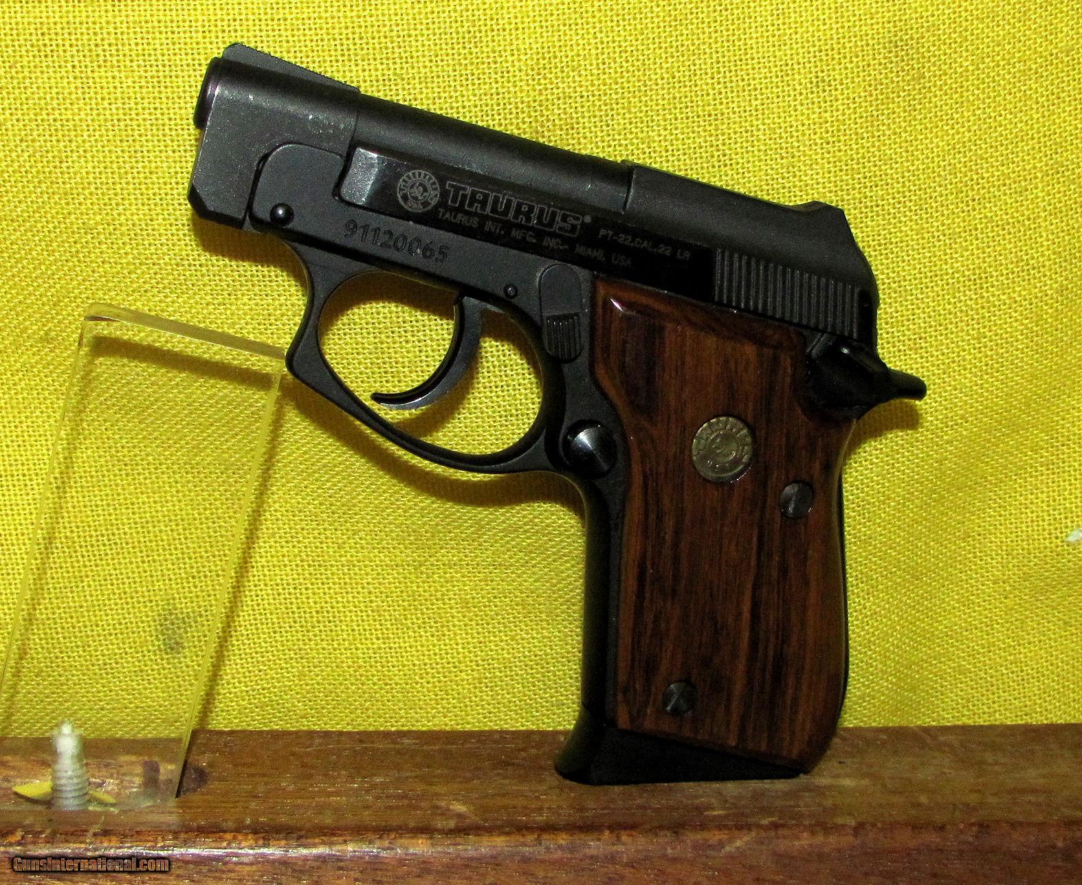 Description: TAURUS model PT-22 (TIP UP) in .22 CAL., with 2 3/4" barrel. Color BLUE. TAURUS MODEL PT-22 TIP UP, BORE AND GRIPS ARE EXCELLENT, COMES WITH ONE FACTORY MAGAZINE, MANUAL WITH NO BOX, LIKE NEW CONDITION. OUR NEW STOCK # D31665 Condition LIKE NEW. Serial number 91120065. SOLD |