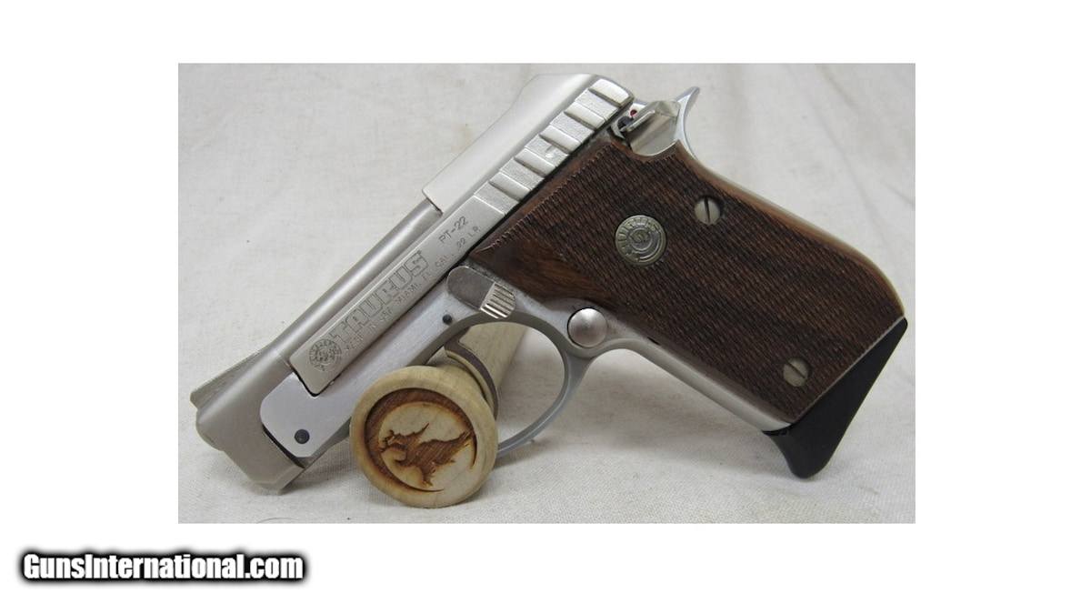 Description: Guns Listing ID: 565672 TAURUS PT-22 22LR 8-ROUND MAG 2.75\" BARREL SEMI-AUTO DAO PISTOL So light you might forget you even have it concealed on your person the Taurus PT-22 is the perfect pocket pistol for you. Chambered in 22 LR this compact gun is perfect for the shooter desiring an unencumbered day or an inexpensive option for a first time gun or practice option. The Taurus PT-22 is a double action only blowback semi-automatic handgun with a 2.75\" tip up barrel that makes for easy loading. When your priority is a light and fast operating firearm the Taurus PT-22 meets your needs. SOLD Manufacturer: TAURUS Model: PT-22 Caliber Info: .22 LR Condition: Used - Non-Certified Barrels: 2.75 BARREL Finish: STAINLESS/WOOD GRIPS |