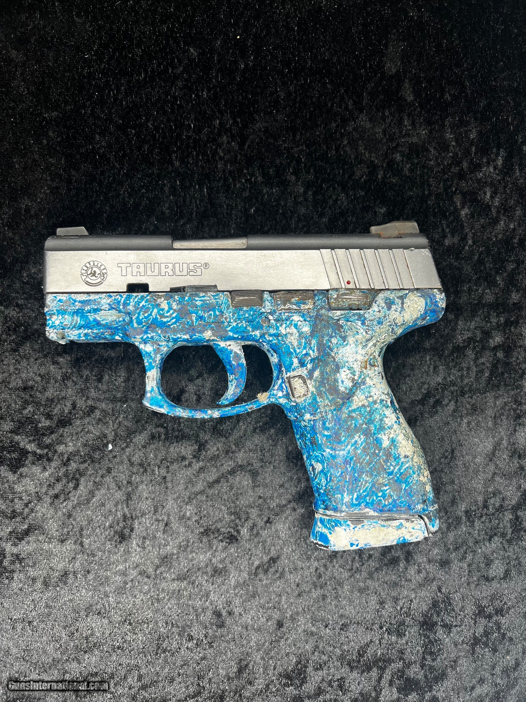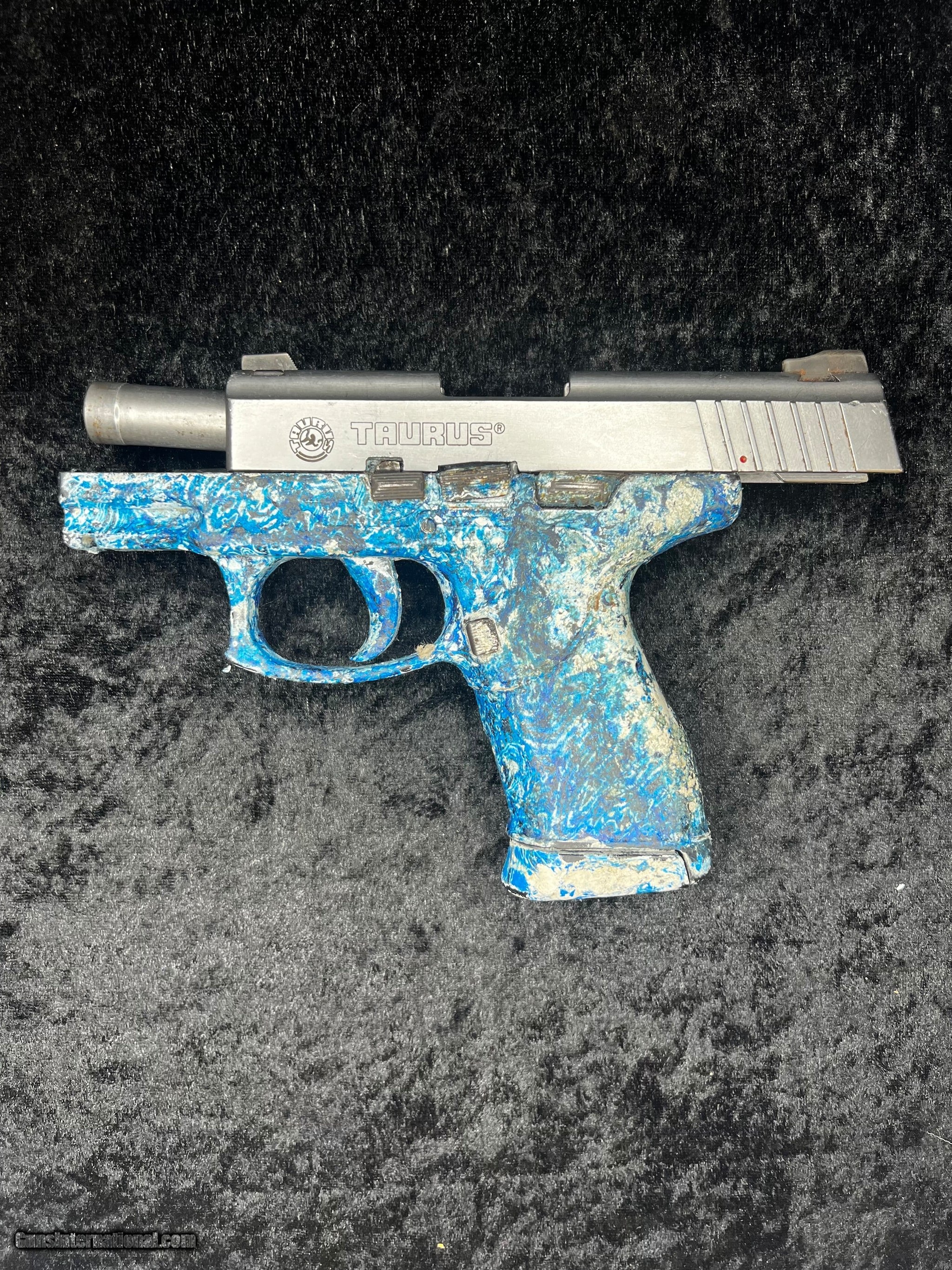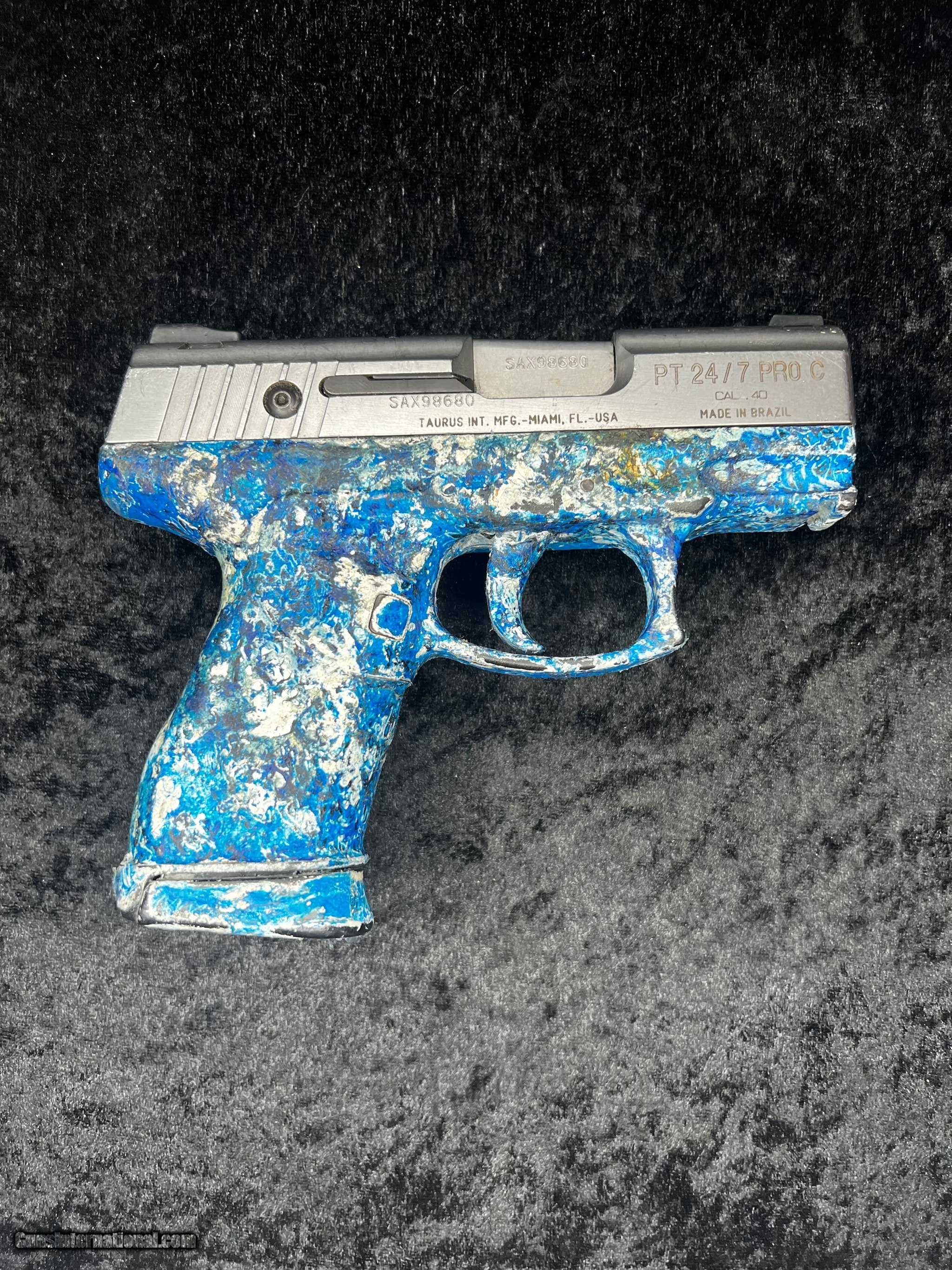 Description: Guns Listing ID: 1083959 Taurus PY T 24/7 PRO C, in fair condition. Dipped in blue, black and white sera-coat. Comes with one 10 round magazine. SOLD Manufacturer: TAURUS Model: PT 24/7 PRO C DS Caliber Info: .40 CALIBER Condition: Used - Non-Certified Barrels: 3.25 BARREL Finish: BLUE AND SILVER |