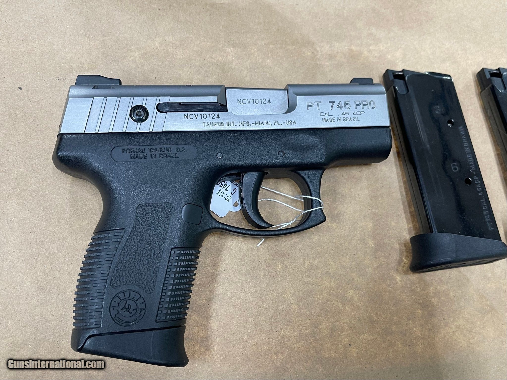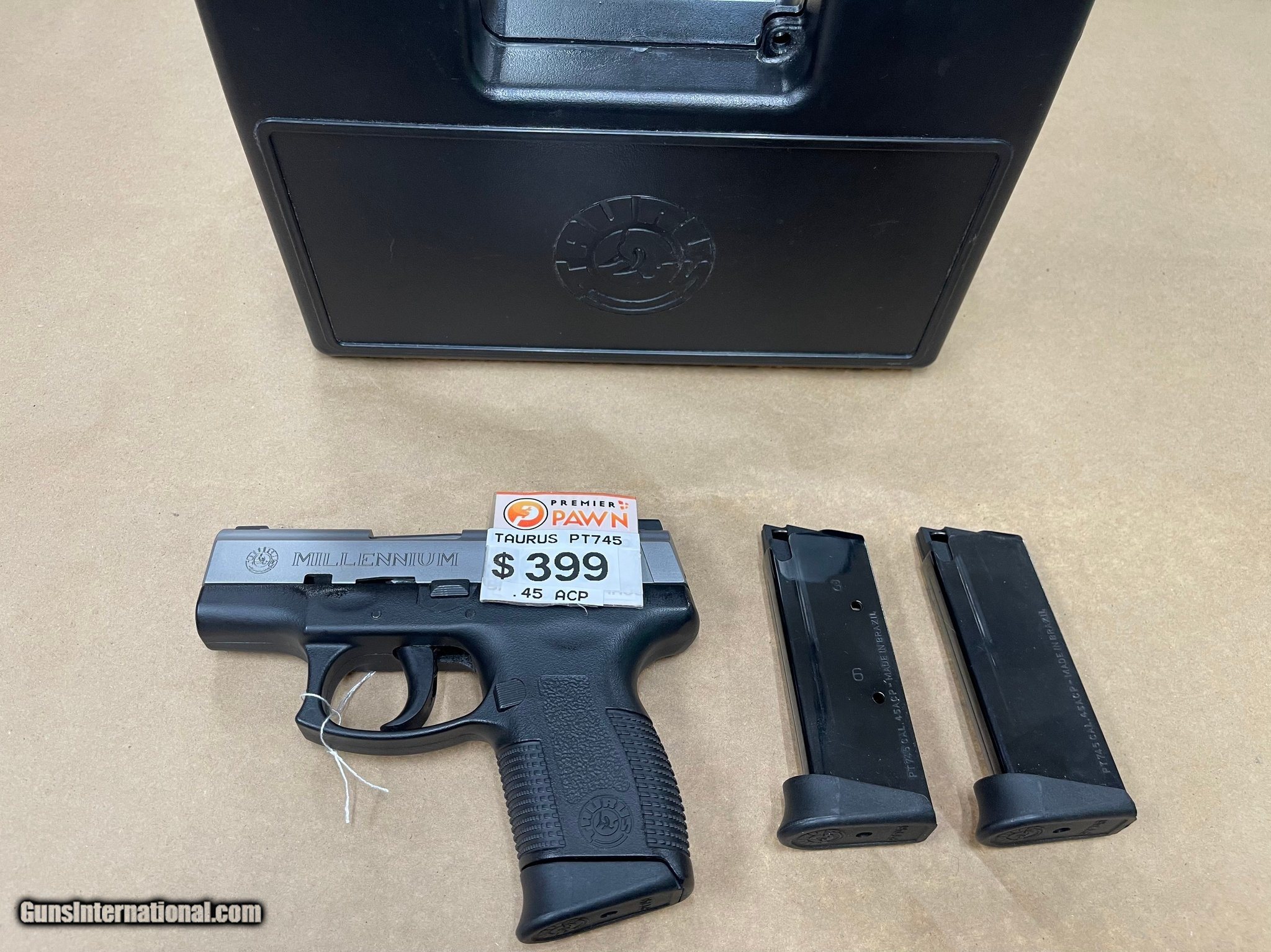 Description: Guns Listing ID: 555597 Well kept together with case and three magazines Loc. SLS FLOOR (G 7450) SOLD Manufacturer: TAURUS Model: PT 745 Millennium Caliber Info: .45 ACP Condition: Used - Non-Certified Barrels: 3" BARREL Action: SEMI AUTOMATIC Finish: two tone |