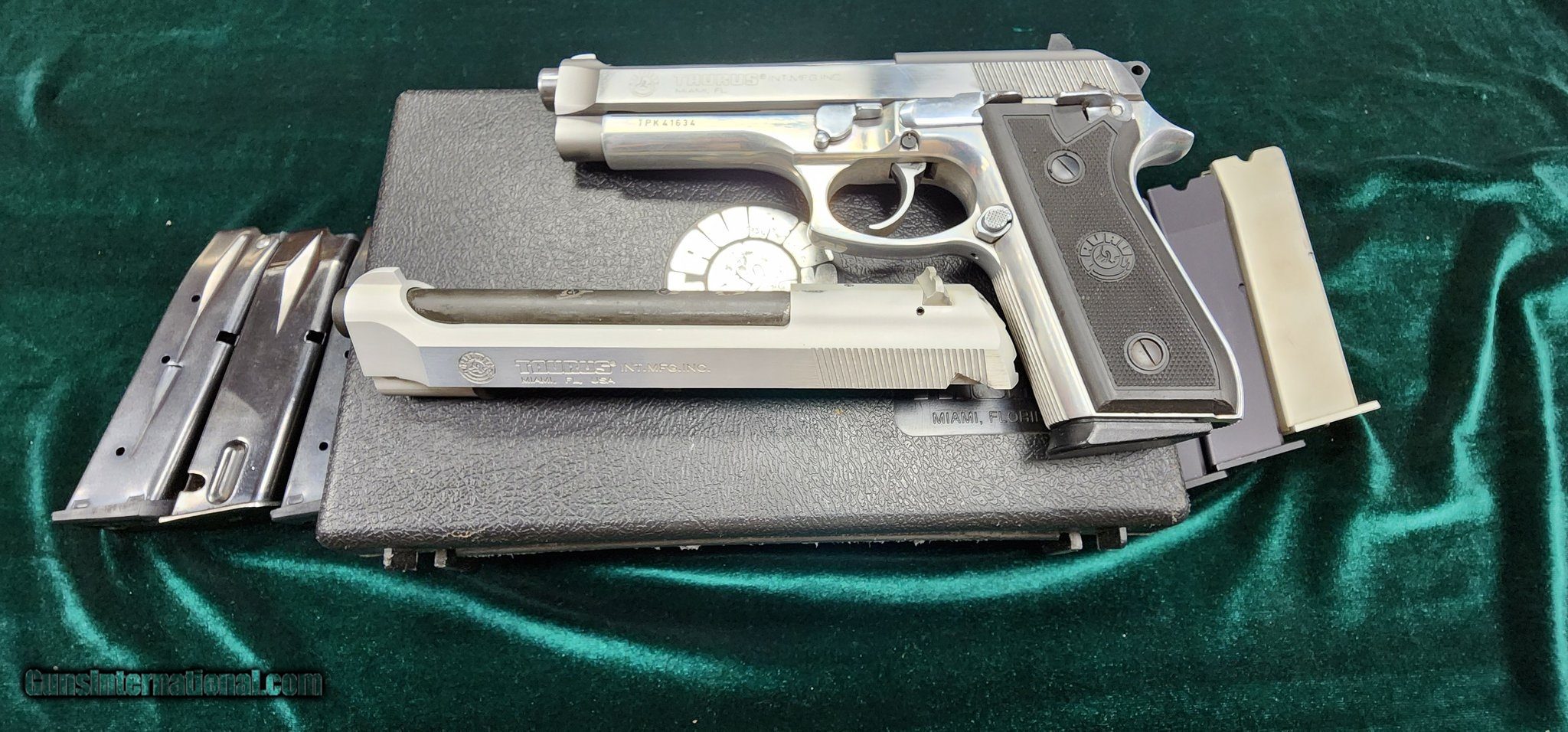 Description: Guns Listing ID: 1317002 This Taurus PT92 is a semi-automatic handgun chambered in 9mm and 22lr. It is built on a drop hammer-forged, ordnance-grade alloy frame and sports a stainless steel finish nicely complemented by black rubber grips with texturing for a secure grasp. The three-position, frame-mounted ambidextrous safety allows for the classic \"cocked and locked\" mode, while an integral rail forward of the trigger guard is ready for your favorite accessories. Reliable and built to last, the PT92 is a suitable choice for personal protection. Comes with 4 9mm mags, and 3 22lr mags. Comes with upper for 22lr. SOLD Manufacturer: TAURUS Model: pt 92 afs Caliber Info: 9MM LUGER (9X19 PARA) Condition: Used - Non-Certified Barrels: 5 BARREL Finish: STAINLESS & BLACK |