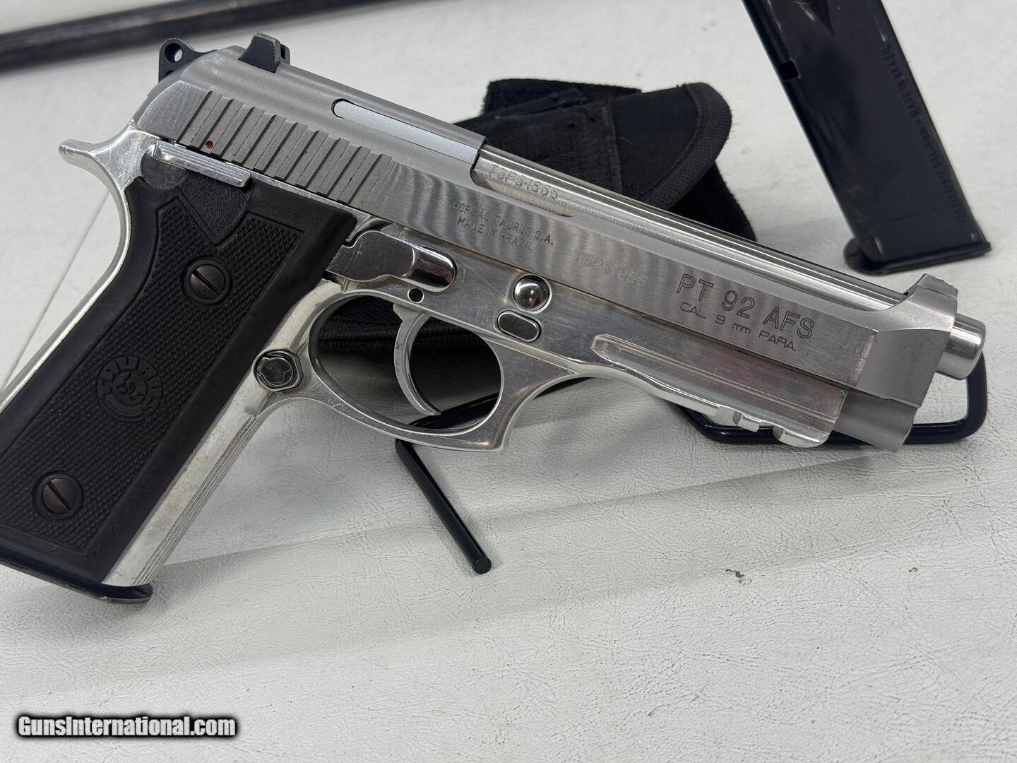 Description: Guns Listing ID: 547318 Comes with two magazines and black holster. Please refer to photos for condition. DETAILS & SPECS Designed with reliability in mind, the Taurus 92 Standard 9mm Luger Pistol boasts a drop hammer-forged, ordnance-grade alloy frame, a stainless-steel slide and a smooth trigger. The Taurus Security System is complemented by a 3-position, frame-mounted ambidextrous safety, a loaded chamber indicator, a firing pin block and a decocker lever. Features and Benefits Single/double action with a 17+1-round capacity 5-inch barrel and a drop hammer-forged, ordnance-grade alloy frame with a stainless finish Stainless-steel slide Smooth trigger Fixed front sight Taurus Security System with a 3-position, frame-mounted ambidextrous safety, a loaded chamber indicator, a firing pin block and a decocker lever Picatinny accessory rail Specifications Action: Single/Double Action Product weight: Product Type: Pistol Product weight (lb.): 2.125 Front sight: Activity: Shooting Magazine capacity: 15+1 Barrel length (in.): 5 Rate of twist: 1 in 9.84 inch Caliber: 9mm SOLD Manufacturer: TAURUS Model: pt 92 afs Caliber Info: 9MM LUGER (9x19 PARA) Condition: Used - Non-Certified Barrels: 5 BARREL Action: SEMI AUTOMATIC Finish: stainless steel |