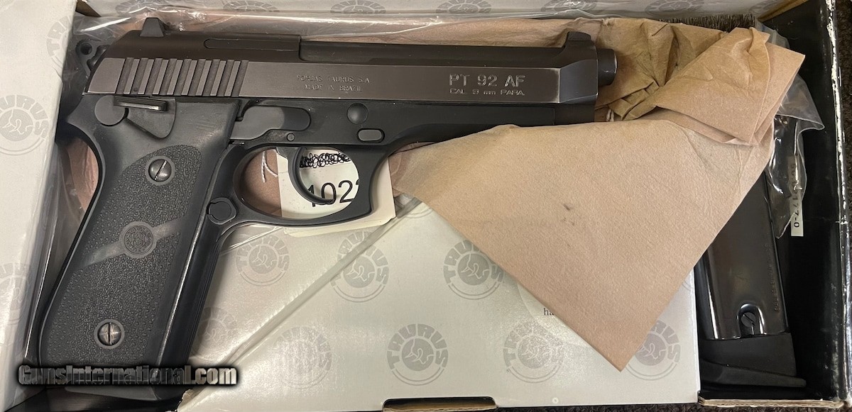 Description: Guns Listing ID: 642768 Taurus PT92 semi auto pistol with box and two magazines total SOLD Manufacturer: TAURUS Model: PT 92 Caliber Info: 9 MM Condition: Used - Non-Certified Barrels: 5 BARREL Finish: BLACK |