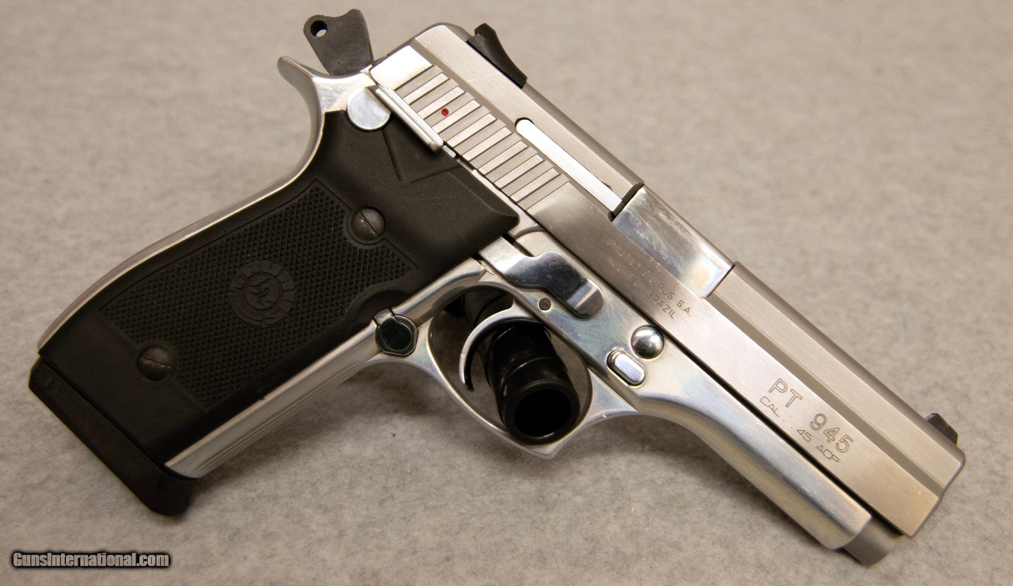 Description: Taurus PT-945 SS, chambered in .45 Auto. Features include: DA/SA, 4 1/4 in. ported barrel, 8 shot single stack mag., ambidextrous 3-position safety and decocker, chamber loaded indicator, 3-dot sights, stainless steel finish, 29 1/2 oz. .45 ACP SOLD Chambers: .45 ACP Metal Condition: Very Good Bore Condition: Very Good Barrels: 4 1/4'' Sights: 3 Dot Item Location: Fort Mill, SC |