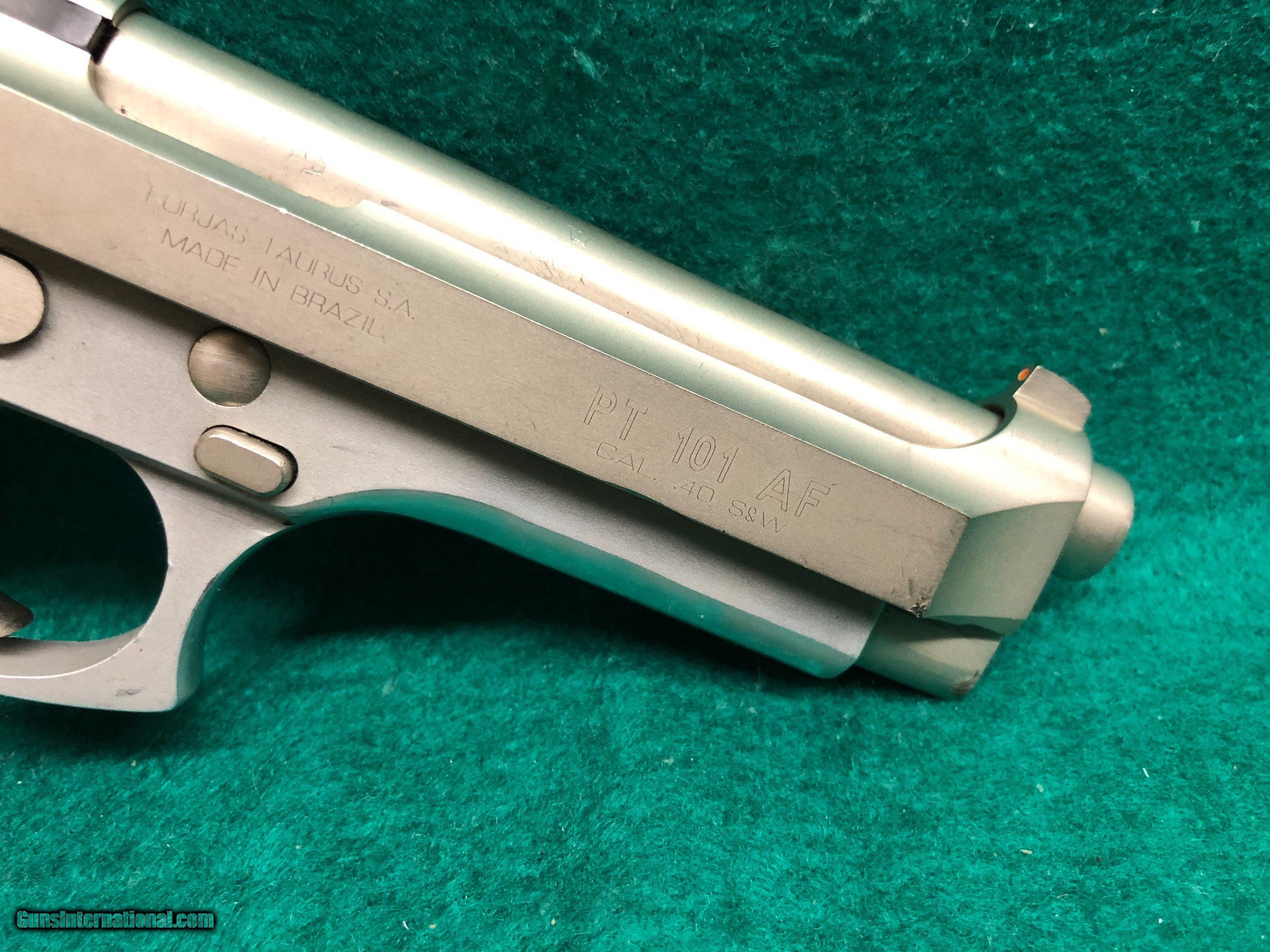 Description: THIS TAURUS PT101AF .40 S&W CALIBER PISTOL IS A COPY OF A BERETTA 96. IT COMES WITH 1 10 ROUND MAGAZINE AND HAS A ALLOY FRAME AND A STAINLESS STEEL SLIDE. IT HAS VISIBLE EXTERNAL WEAR BUT SEEMS TO LOCK UP TIGHT AND FUNCTION. CAN NOT BE SOLD IN CA. SHIPPING IS $30.00 SOLD Handgun Caliber: .40 Smith & Wesson (.40 Auto, 10 x 21 mm) Manufacturer: TAURUS Model: PT101AF Serial Number: SLA07474 Condition: FAIR |