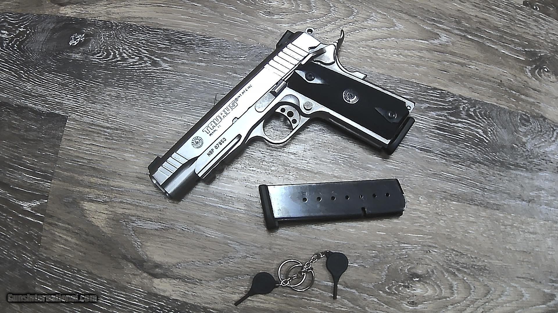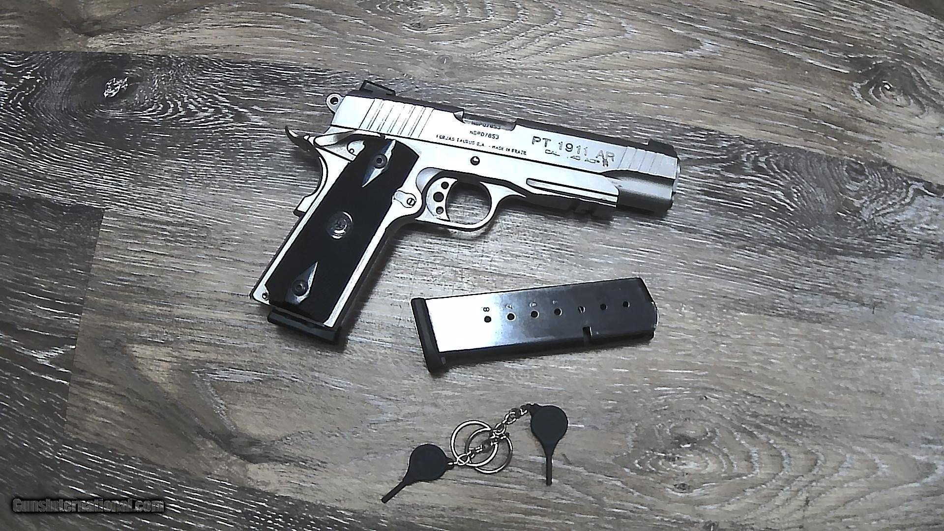 Description: Guns Listing ID: 569914 USED PT1911 Taurus. Chambered in 45ACP. Includes 2-8rd magazines and the Taurus key locks. Function and finish are in very good condition. Has a orange front sight and a 2 white dot rear sight. Ambidextrous safety, larger beaver tail grip safety, recoil spring guide rod, and a lot of features other more expensive models don‚t have. This is a great buy..... SOLD Manufacturer: TAURUS Model: PT1911 Caliber Info: .45 ACP Condition: Used - Non-Certified Barrels: 5" BARREL Action: SEMI AUTOMATIC Finish: BRUSHED STAINLESS |