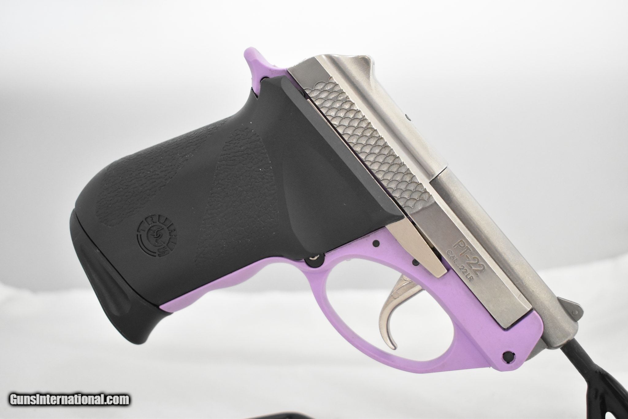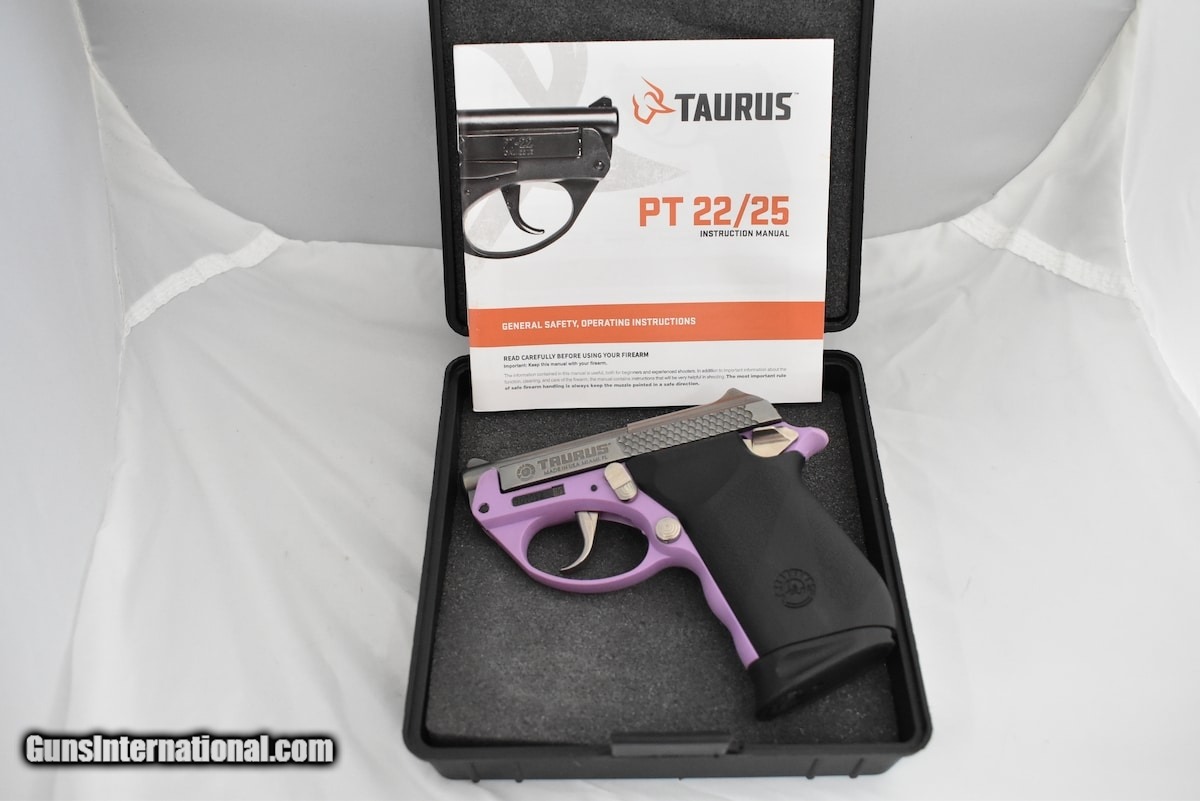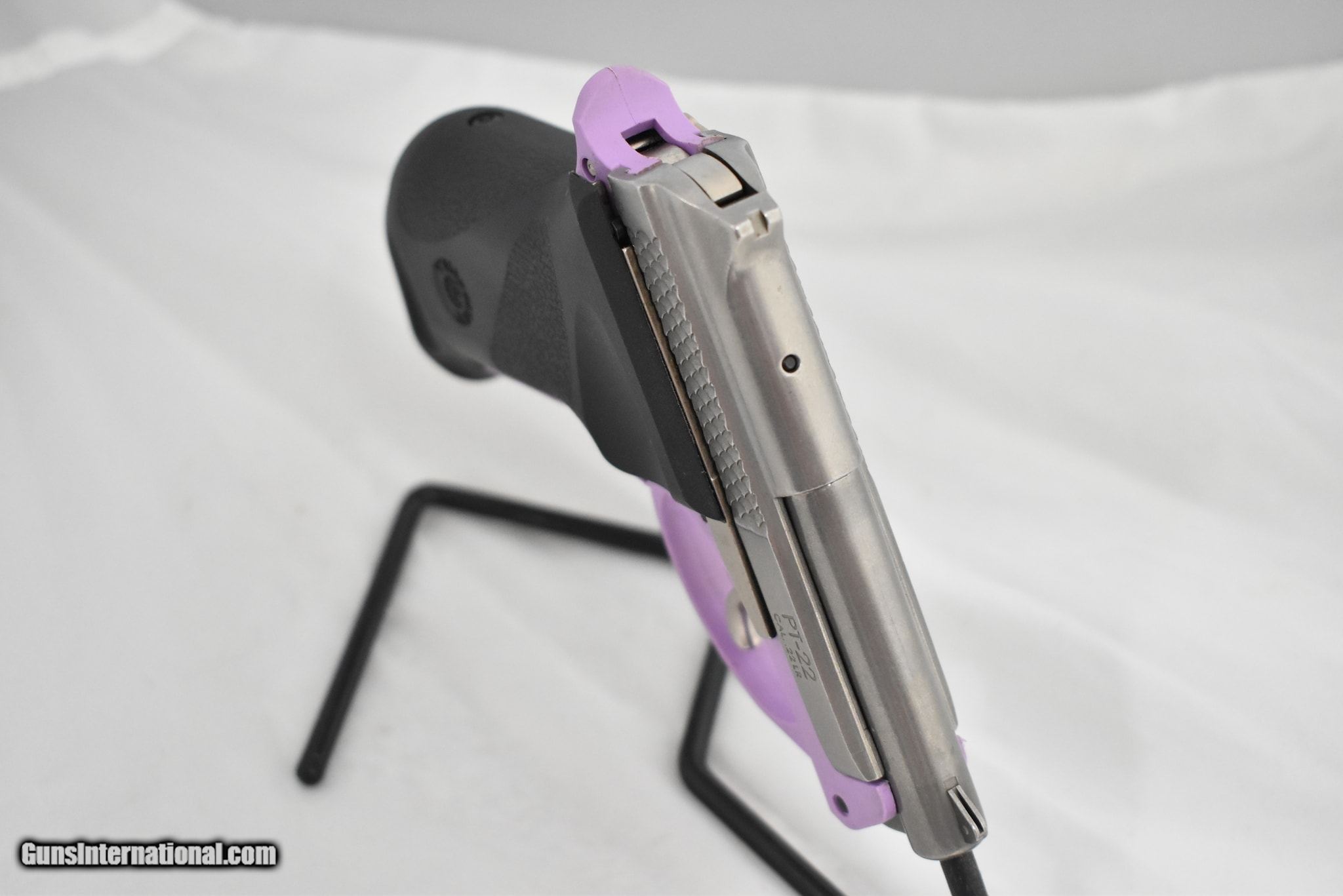Description: Guns Listing ID: 745776 Excellent condition. Features lavender purple frame and tip up barrel. Double action only. Includes original box, manual, and keys for internal locking system. Magazine holds 8 rounds. SOLD Manufacturer: TAURUS Model: PT22 Caliber Info: .22 LR Condition: Used - Non-Certified Barrels: 2.75 BARREL Finish: LAVENDER AND STAINLESS |