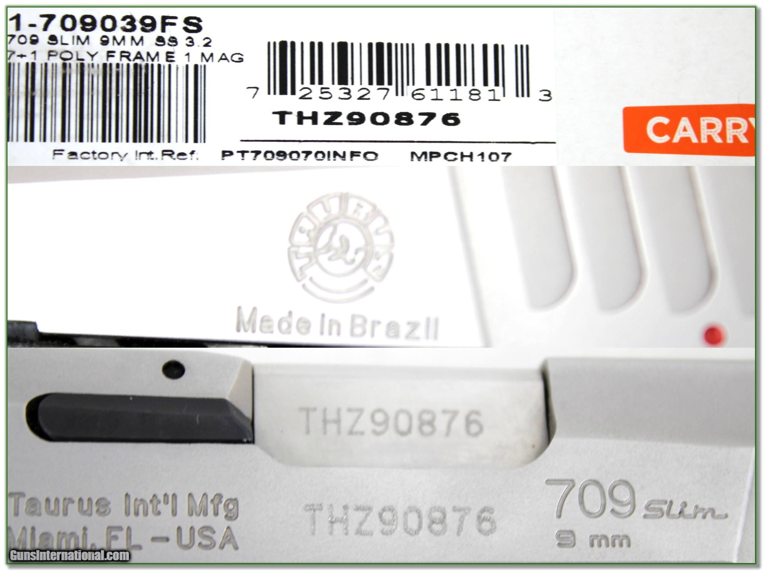 Description: This is a like new and in the box Taurus 709 Slim 9mm. It has a stainless slide and comes with 2 magazines. Both have an added grip extender as seen and original magazine ends are included. It also includes a leather holster. I am selling this one on consignment and as such lay-a-way can’t be used. It does of course have the standard 3-day inspection. Shipping and insurance is $39. Please email me with any questions or larger pictures. (Consign your quality firearms with Shooting Investments for only 12%! Let me know if you have any you would like to sell!) 22-0292 Payment: Payment is by Money Order, Cashiers Check or Personal Check. I can now also accept Credit Cards (MasterCard, Visa, Discover & American Express) with a 3% convenience fee. Shipping: The shipping charge will be listed in each description. It is $49 for most long guns. Some heavy guns, over 48in boxes or those insured for over $2000 will be higher. Shipments to Alaska and Hawaii are higher because air shipment is required. Most firearms are shipped on Tuesday and Thursday and usually in 5 days of receipt of payment. We package all shipments carefully and insure them. Optics are shipped Priority Mail and most other non-firearm shipments are shipped First Class. Returns: Our return policy is simple. If for any reason you are not pleased with your purchase, you may return your item for a full refund of purchase price. Ammunition cannot be returned. It is important to us that you are happy. Guns cannot be fired or dissembled before returning them and they must be returned in the same condition as received. Notification of a return must occur with-in 3 days of receipt at your dealer. Shipping, convenience and dealer fees are not refundable and are the responsibility of the buyer. Lay-a-way: If needed, we offer a 60 day lay-a-way option on most firearms. It is 1/3 now, 1/3 in 30 days and 1/3 in 60 days. Lay-a-way firearm sales are final and if not completed the first payment cannot be returned. Consigning your firearms with Shooting Investments: We will help you get top dollar for your firearms. While most local guns shops charge 20% or more, our fee is only 12% with a minimum of $75. At your local gun shop it might take months to sell. Selling on-line provides instant access to thousands of interested buyers. You won’t find any other on-line dealer willing to sell your firearms for only 12% or listing every gun on 3 separate s. Selling through an House typically costs the seller 15% and the buyer an addition 15% (so 30%) and you have to wait several months to sell and longer to receive funds. If properly priced, we will sell your firearms in a few weeks. Send us an email or give us a call and we’ll explain how easy it is for you to get top dollar. Trading: Trading for use is really just buying your gun to re-sell. If you have a gun you want to trade, please email a picture and we will let you know what we can give or it. You will always get more if we sell it for you on consignment. Help for California Buyers: We are happy to ship to California. It is the buyer’s responsibility to make sure any item you buy is legal in your state. We are also happy to help with your purchase of a firearm from someone other than us. If you see a gun you would like to buy but the seller can’t or won’t ship to California they can ship to use and we’ll then ship it to your California dealer. The cost for this service is only $30 + shipping. Let us know if we can help! SOLD |