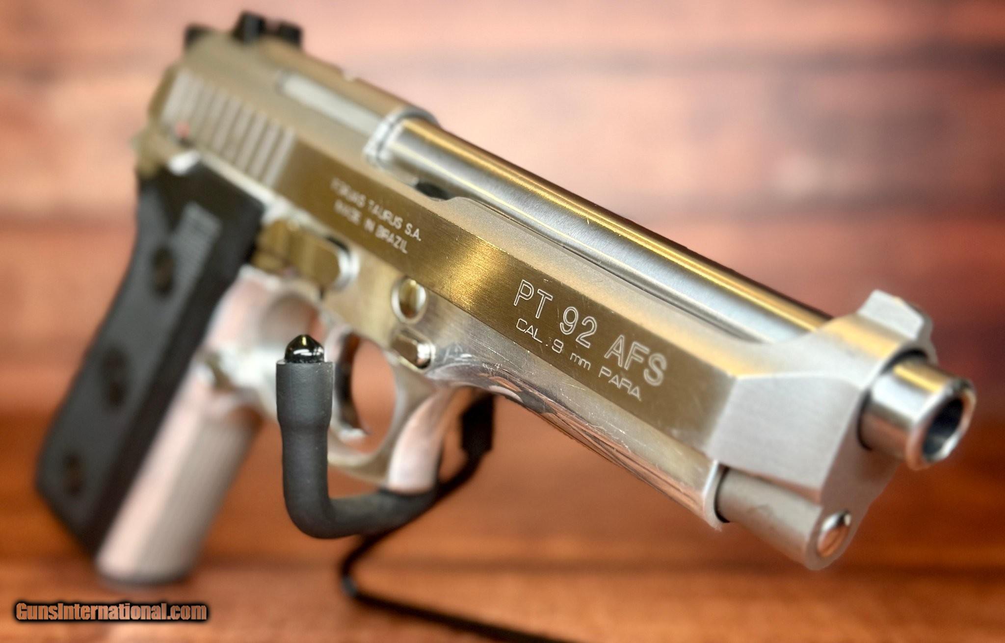 Description: Guns Listing ID: 557154 Discover the Taurus PT 92 AFS, a semi-automatic pistol that stands as a testament to precision engineering and historical significance. This pistol is a blend of Brazilian craftsmanship and an American import legacy, modeled after the renowned Beretta 92. This firearm features a double-action/single-action (DA/SA) trigger system, a 5.0\" barrel, and a generous magazine capacity, making it a favored choice among both seasoned enthusiasts and collectors alike. The polished stainless finish provides a timeless aesthetic while the factory roll-marks and engravings highlight its authenticity and international heritage. With its roots tracing back to a pivotal collaboration in firearm history, the PT 92 AFS offers both functional reliability and collectible allure. In terms of condition, this Taurus PT 92 AFs is in very good shape, exhibiting only light, superficial signs of handling or use. The slide shows minor scratches and scuffs, yet the bore remains in excellent condition with a clean, mirror finish that reflects its limited use. The rifling retains sharp lands and grooves, ensuring consistent accuracy. This sale includes the pistol itself and one 15-round magazines—providing ample capacity for any shooting activity. Also included is a soft pistol case. The PT 92‚s design origins from Beretta‚s venture in Brazil add an intriguing historical layer. When Beretta‚s contract with the Brazilian military concluded, Taurus took over the factory, continuing production with their own enhancements. This resulted in a robust, reliable firearm that has been a staple in Taurus‚s lineup since the early 1980s. Its durability and performance make it an excellent option for both self-defense and range use. The high-capacity magazines and DA/SA action ensure versatility, while the fixed 3-dot sights provide quick target acquisition. Owning this Taurus PT 92 AFS means possessing a piece of firearm history, one that embodies a successful international collaboration. Whether for practical use or as a collector‚s item, this pistol offers unmatched value, combining history, performance, and aesthetic appeal. Elevate your collection or enhance your shooting experience by adding this distinguished firearm to your arsenal. Specifications Manufacturer: Taurus Model: PT 92 Submodel: AFS Caliber: 9mm Luger (9x19 Para) Overall Condition: Very good condition Bore Overall Condition: Excellent - Clean, mirror finish Bore Rifling: Excellent Rifling - Sharp lands and grooves Action: Double-action/single-action (DA/SA) Barrel Length: 5.0\" Finish: Polished Stainless Stock/Grips: Black factory checkered polymer grips with Taurus logo medallions Sight/Optic: 3-dot fixed Country of Origin: Brazil SOLD Manufacturer: TAURUS Model: PT92 AFS Caliber Info: 9MM LUGER (9x19 PARA) Condition: Used - Non-Certified Barrels: 5" BARREL Action: SEMI AUTOMATIC Finish: polished stainless |