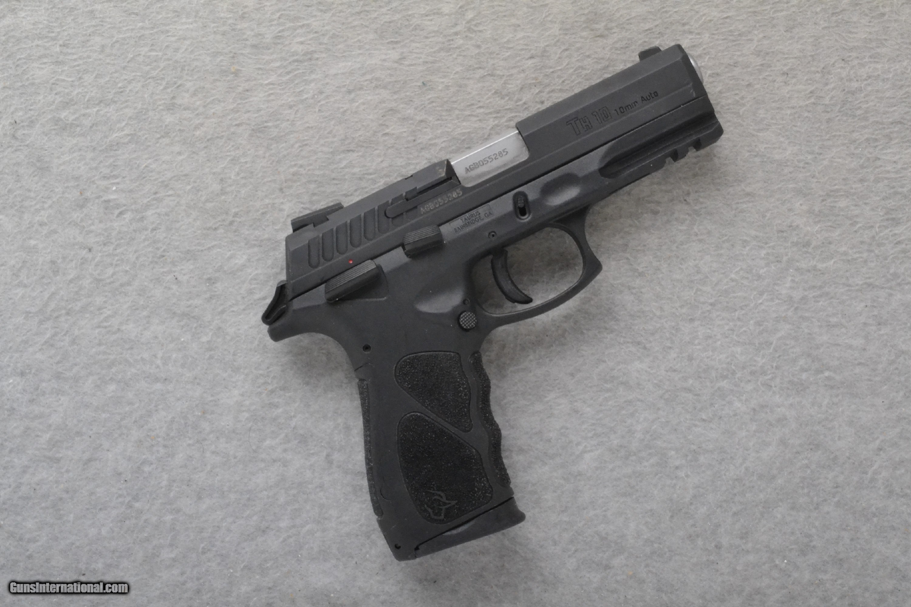 Description: This Taurus TH 10 is a right hand semi-auto pistol in 10MM Auto Cal. The barrel is 4 inches long. It has a serrated slide and a bottom accessory rail. It has a fixed blade with a white dot front sight, and an adjustable notch rear sight. The pistol grip is polymer with textured inlay side panels. The front strap is textured polymer with finger rests, and the back strap is textured polymer. 10mm Auto Chambers: 15 round detachable magazine Bore Condition: Excellent Barrels: 4 Weight: 2 lbs Sights: "Fixed blade with a white dot front, adjustable notch rear Item Location: Richfield, WI Price: $399.99 Contact Seller |