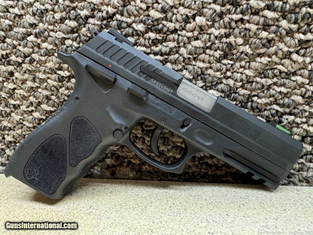 Description: Guns Listing ID: 1398079 This listing is for a USED Taurus TH45 SA/DA 45 ACP Black Finish Thumb Safety 4.25\" BBL 13+1. This is a used gun, it has been fired and will have residue present. This Taurus TH45 is chambered in 45 ACP, and it will hold 13 rounds in the magazine. This pistol comes with a 4.25 inch barrel. It comes equipped with a fixed fiber optic front sight, and a fixed rear sight. Other than a few light scratches around the ejection port and on the barrel, this pistol appears to be in great condition. The action appears to be in good condition, the finish appears to be in good condition, and the bore appears to be in good condition. This pistol comes with two 13 round magazines, two extra backstraps, a speed loader, an owner’s manual, and the hard case. This would be a great plinking or self-defense pistol. ** DISCLAIMER** THIS FIREARM HAS NOT BEEN TEST FIRED*** SOLD Manufacturer: TAURUS Model: TH-45 Caliber Info: .45 ACP Condition: Used - Non-Certified Barrels: 4.25 BARREL Finish: BLACK |