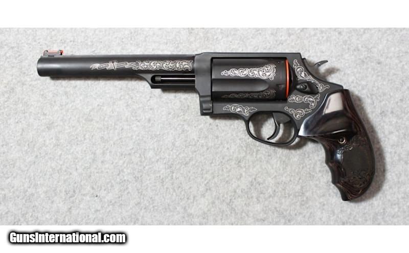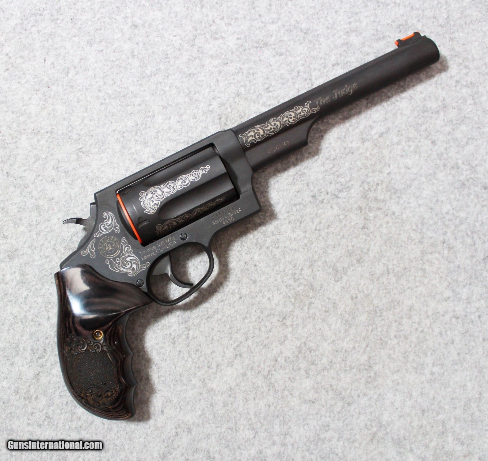 Description: Taurus The Judge double action revolver chambered in .45LC/.410. It has a 6.5" barrel, the front sight is orange fiber optic, and the rear sight is a fixed frame u-notch. The wood grips have scroll work, and finger grooves. Includes factory box, and an extra set of factory black rubber grips. Free shipping to any Bass Pro Shops or Cabela's store. .45 Colt / 410 Gauge Metal Condition: Very Good Wood Condition: Very Good Bore Condition: Bright and Clear Barrels: 6.5 inch Triggers: Double Action / Single Action Weight: 40 oz Sights: Front: Orange Fiber Optic / Rear: Fixed Frame U-Notch Item Location: Allen, TX Price: $499.99 Contact Seller |
