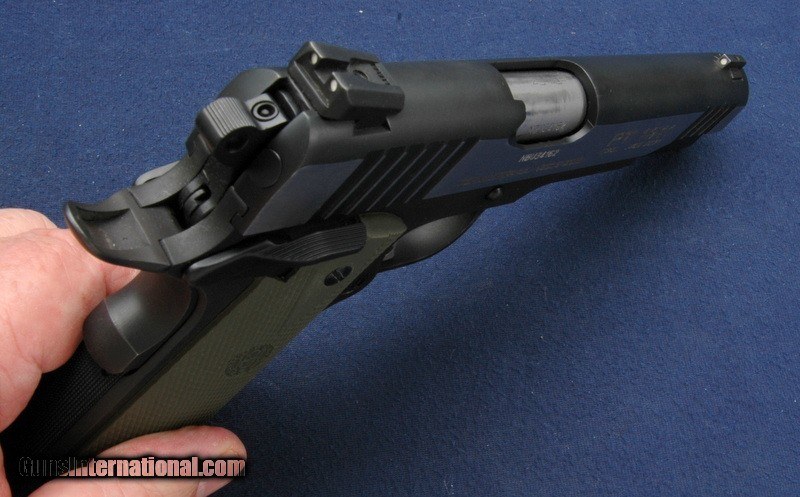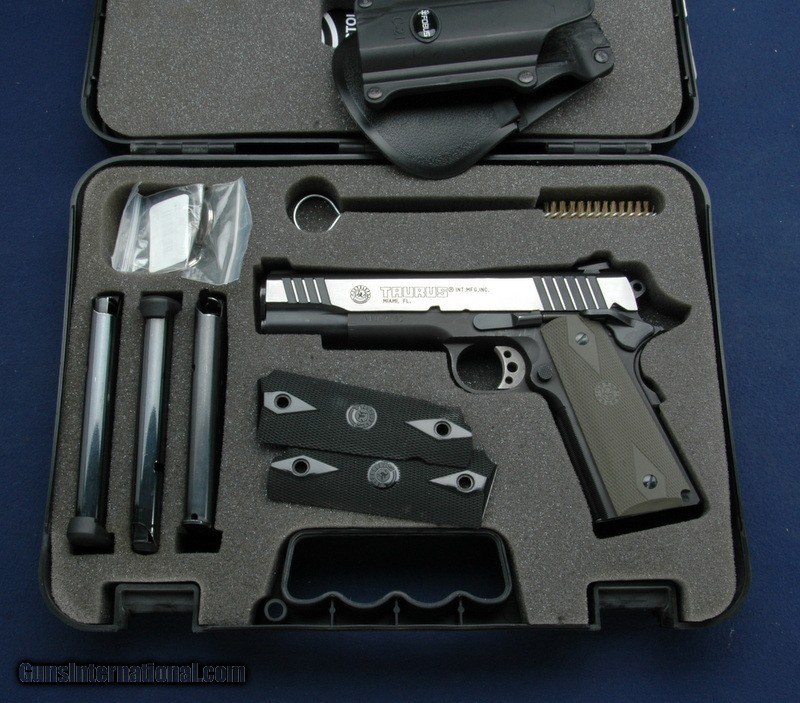 Description: Pretty nice gun here. Yes- it is a Taurus, yes- you generally get what you pay for. This one is finished pretty well, it's got a decent trigger, ambi-safety, full length guide rod, decent sights. Comes in the factory box with four magazines. Original grips, cleaning brush, also a right hand OWB Fobus paddle holster. Nice package at a great price. $35 shipping to the lower 48, 3% surcharge for using a CC. If you choose to pay with a personal check, we will hold the item for up to 10 days to make sure that it clears. Please expedite such pymts as we will hold an item on your word for 5 days. SOLD |