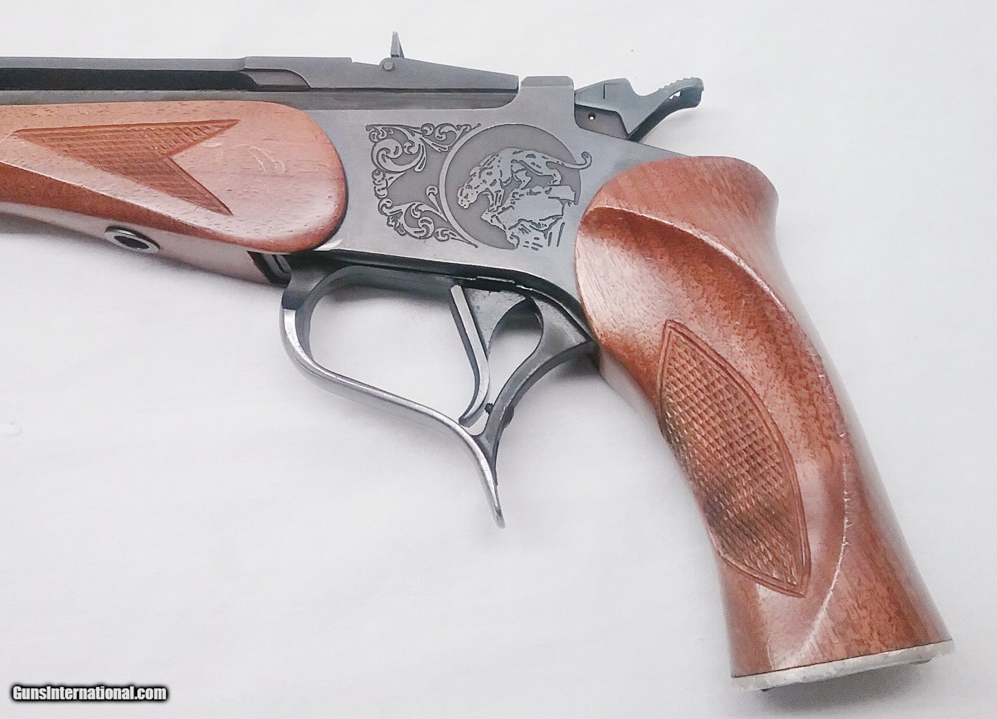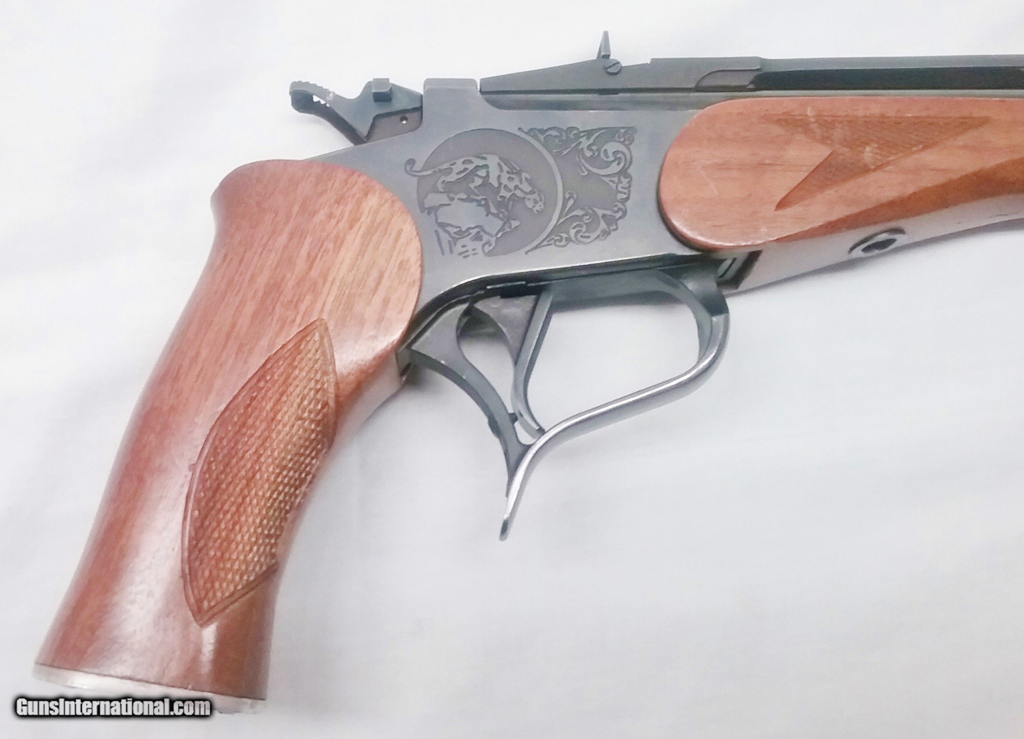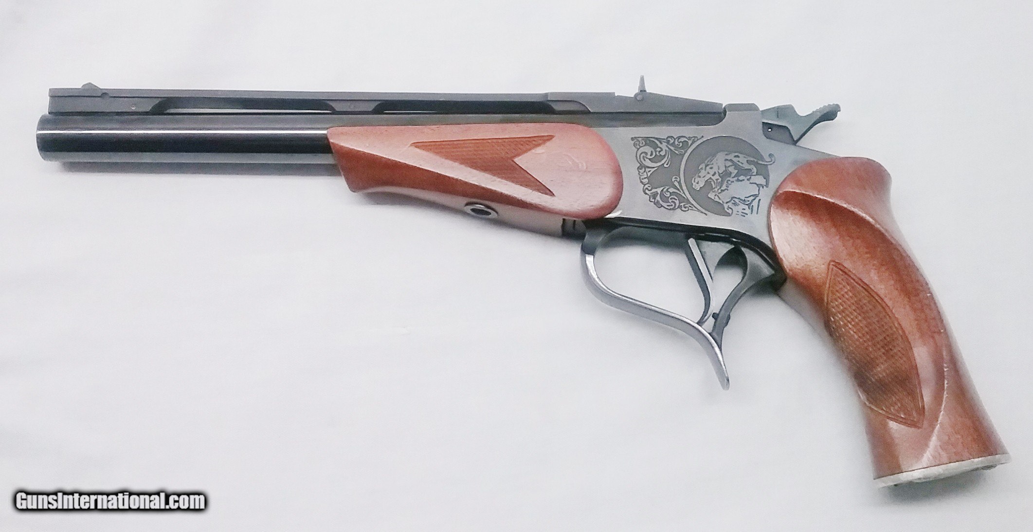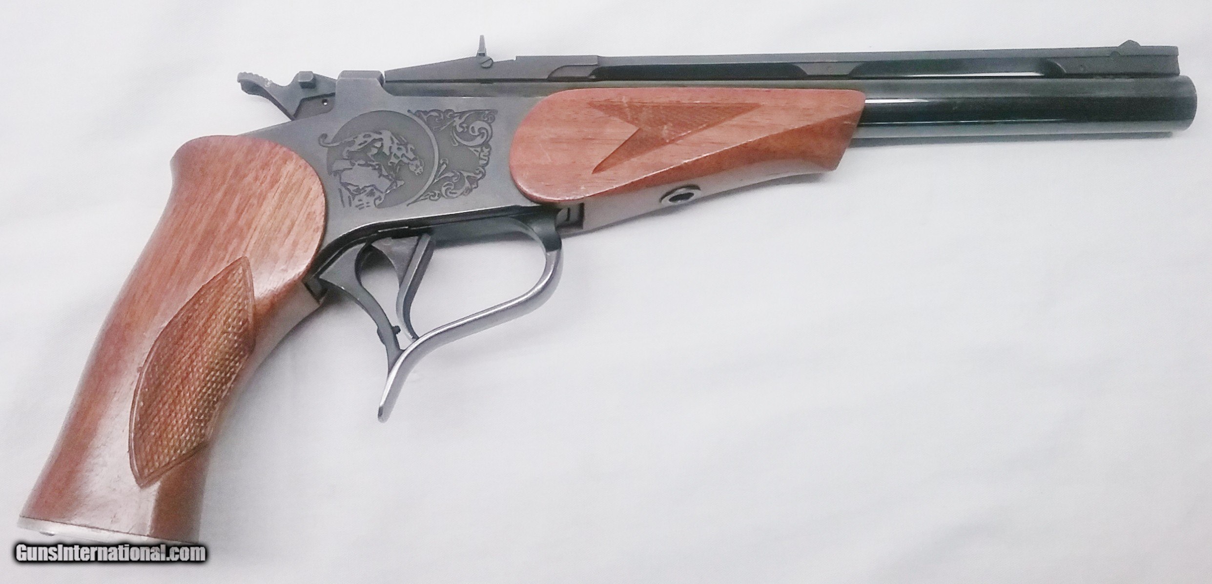 Description: This .357 Magnum Thompson Center Contender Pistol has a 10” blued tapered round barrel mounted with a ventilated rib and flip up adjustable rear sight. The barrel is ported and comes with a removable choke designed for .357 shot shells. The bore is very good. Stamped on the left side of the barrel is Thompson : Center Arms Rochester, N H. 357 Mag. The checkered American Walnut pistol grip and forend are in good condition with the exception of some handling marks. The aluminum pistol grip cap features a Puma. The receiver is laser engraved with the T/C Puma logo on both sides. Overall, this pistol is in very good condition. Weight is 2 lbs. 15 oz. Our stock number is #C75. Will ship to any FFL in the United States. Buyer pays freight and insurance. SOLD Manufacturer: Thompson Center Model: Contender Caliber Info: .357 Mag Bore: Rifled Condition: Very Good Metal Condition: Very Good Wood Condition: Good Bore Condition: Very Good Barrels: One Barrel Type: Tapered Round Action: Break Open Triggers: One Fore End: American Walnut Rib: Ventilated Finish: Blued Weight: 2 lbs, 15 oz. Sights: Adjustable Chokes: Removable Item Location: OR |