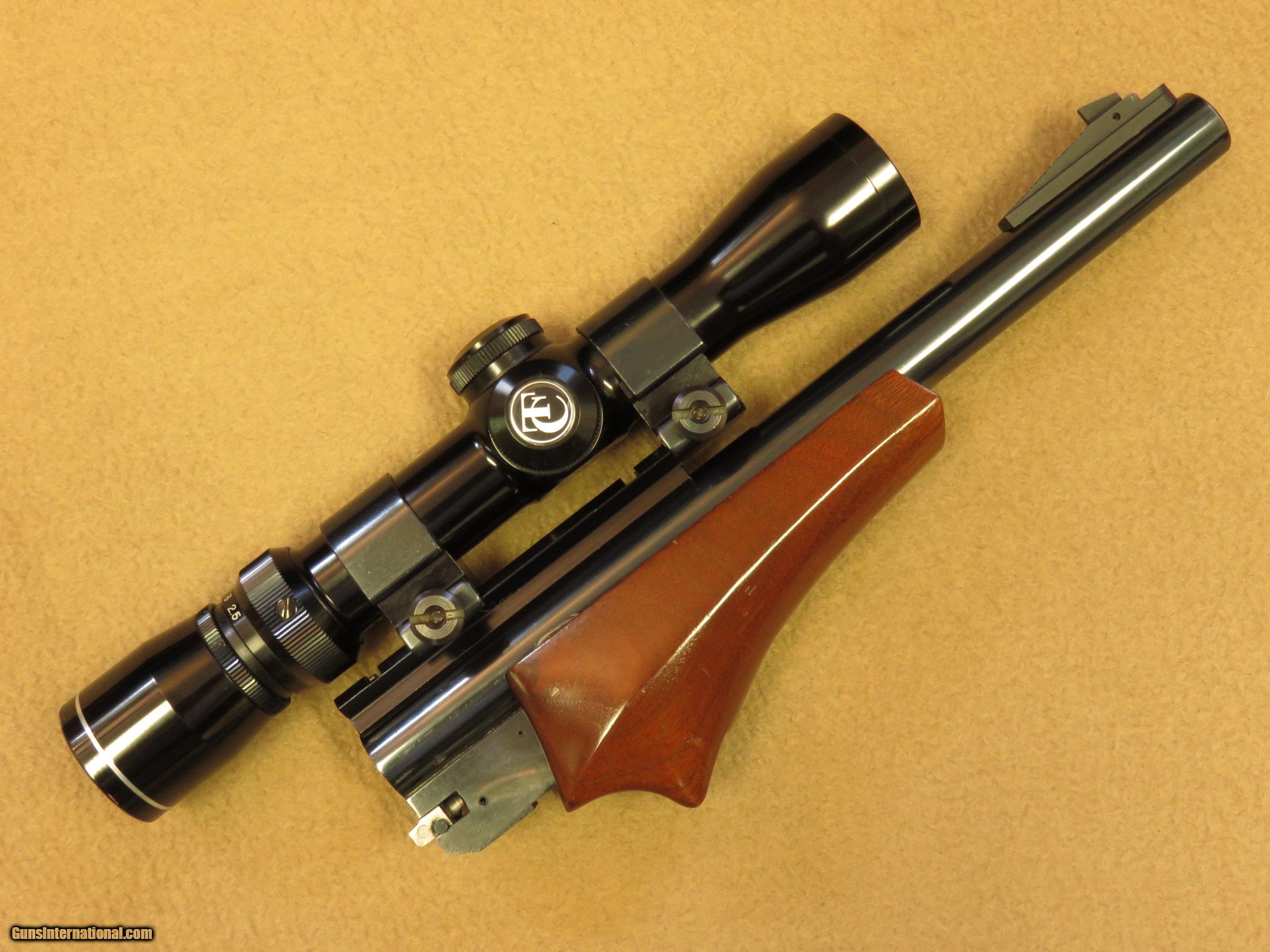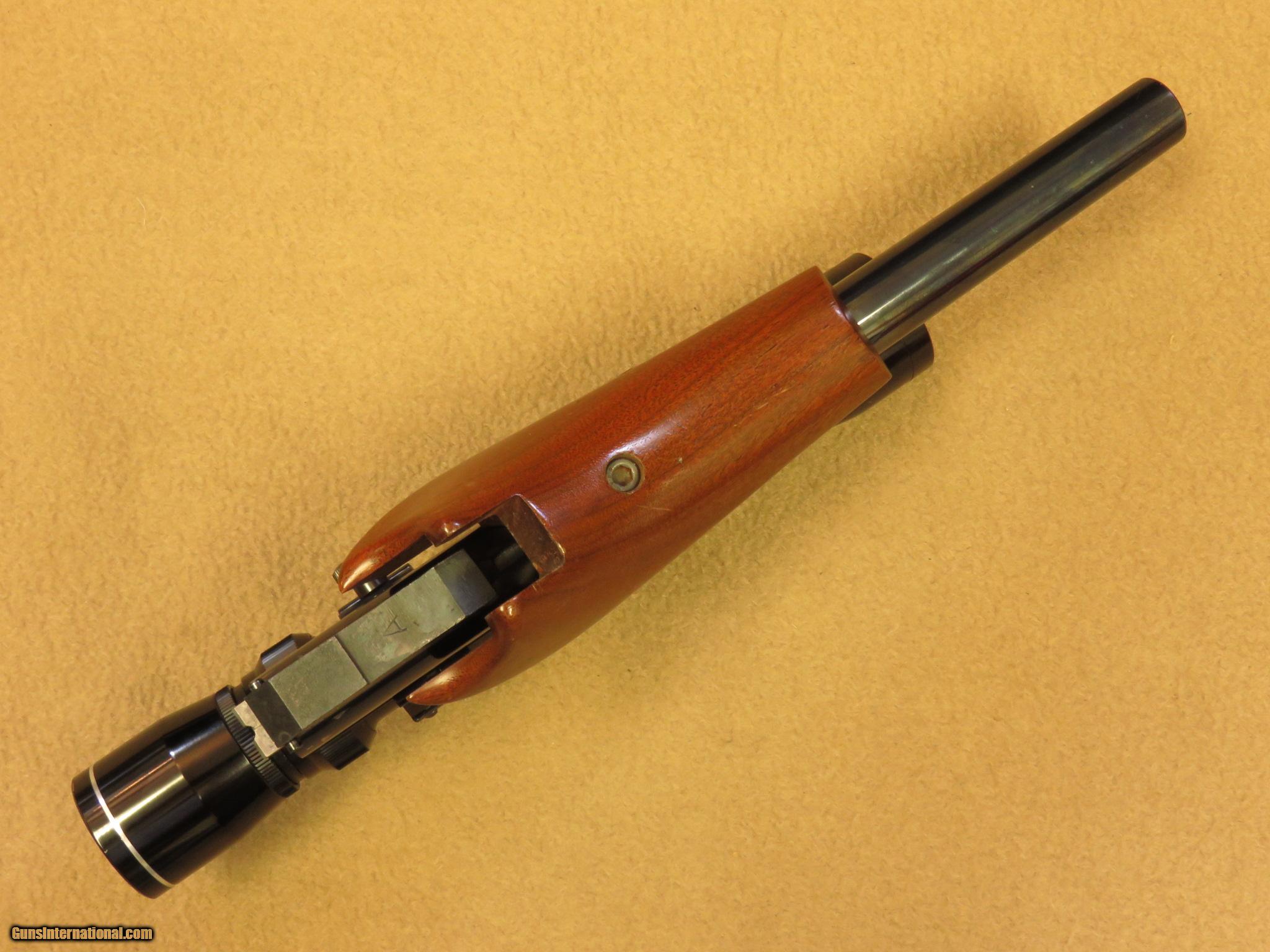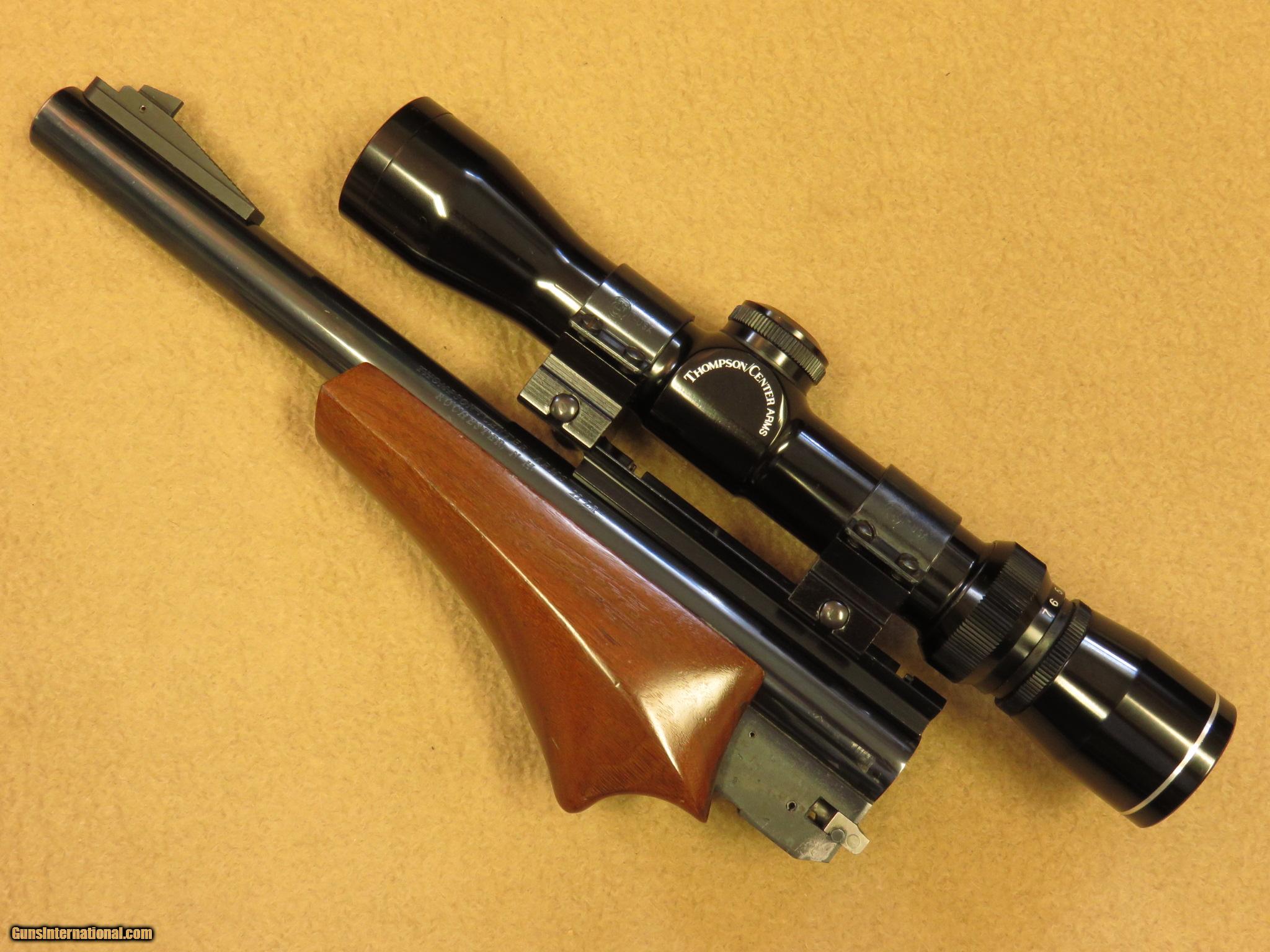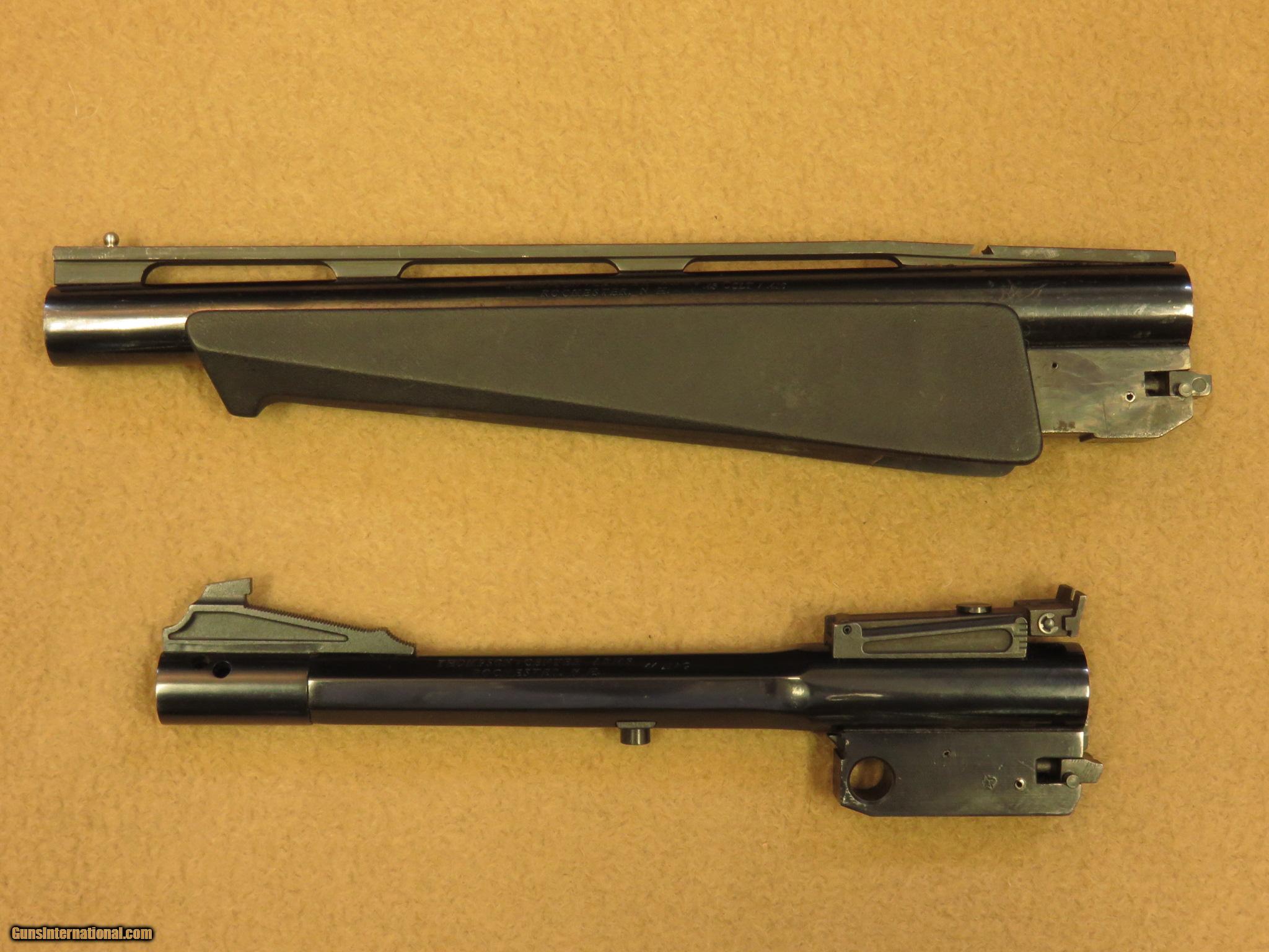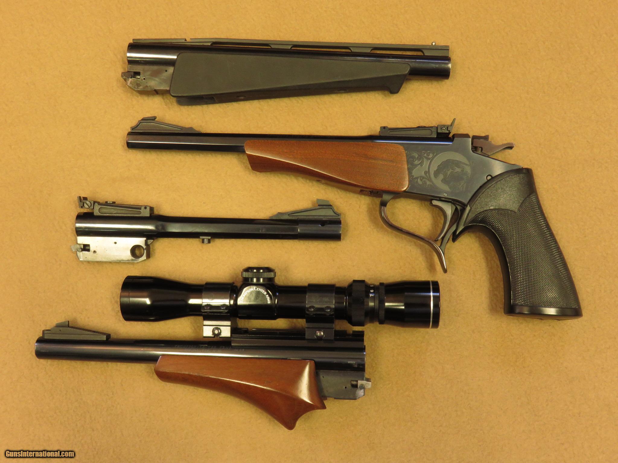 Description: Thompson Center handgun with 4 barrels. Comes with a 30/30 barrel (presently attached to receiver/grip) 10 inches in length, a ported .44 Magnum barrel 8 1/8 inches in length, a .45 LC/.410 ribbed barrel 10 inches in length, and a .22 LR barrel 10 inches in length with a 2.5 to 7 power Thompson Center Arms scope (duplex reticle and clear) attached. Gun and barrels retain most all of their original blue finishes with assorted thinning on some sharp edges and handling marks. The receiver retains most all of original finish, again with some thinning on some of its sharp edges and some handling and use marks. A great set. PRICE: $695 We are Antique & Modern Firearms in Lexington, KY, dealer of fine firearms since 1974. PH. 859-276-1419 We Buy, Sell and Trade. Have a firearms collection to sell, let us know. (sales at am-firearms) SOLD |