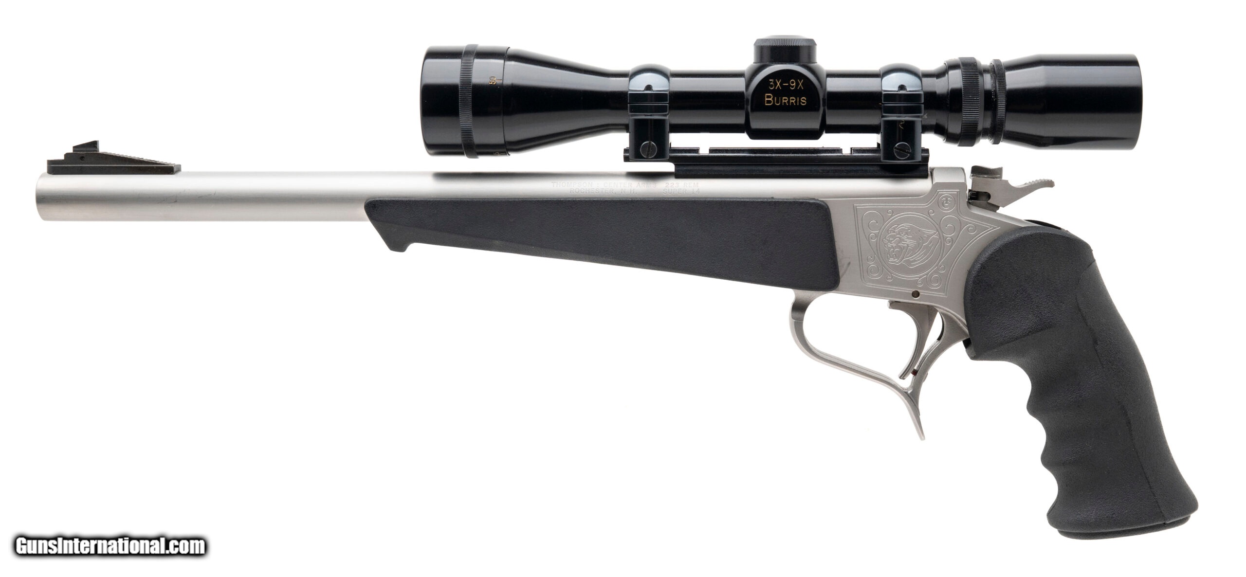 Description: "SN: S9801. Made in 1993, .223 Rem with a 14"" barrel. Stainless steel single shot pistol with synthetic stock. Has a Burris 3x-9x scope mounted. Excellent condition. SOLD |