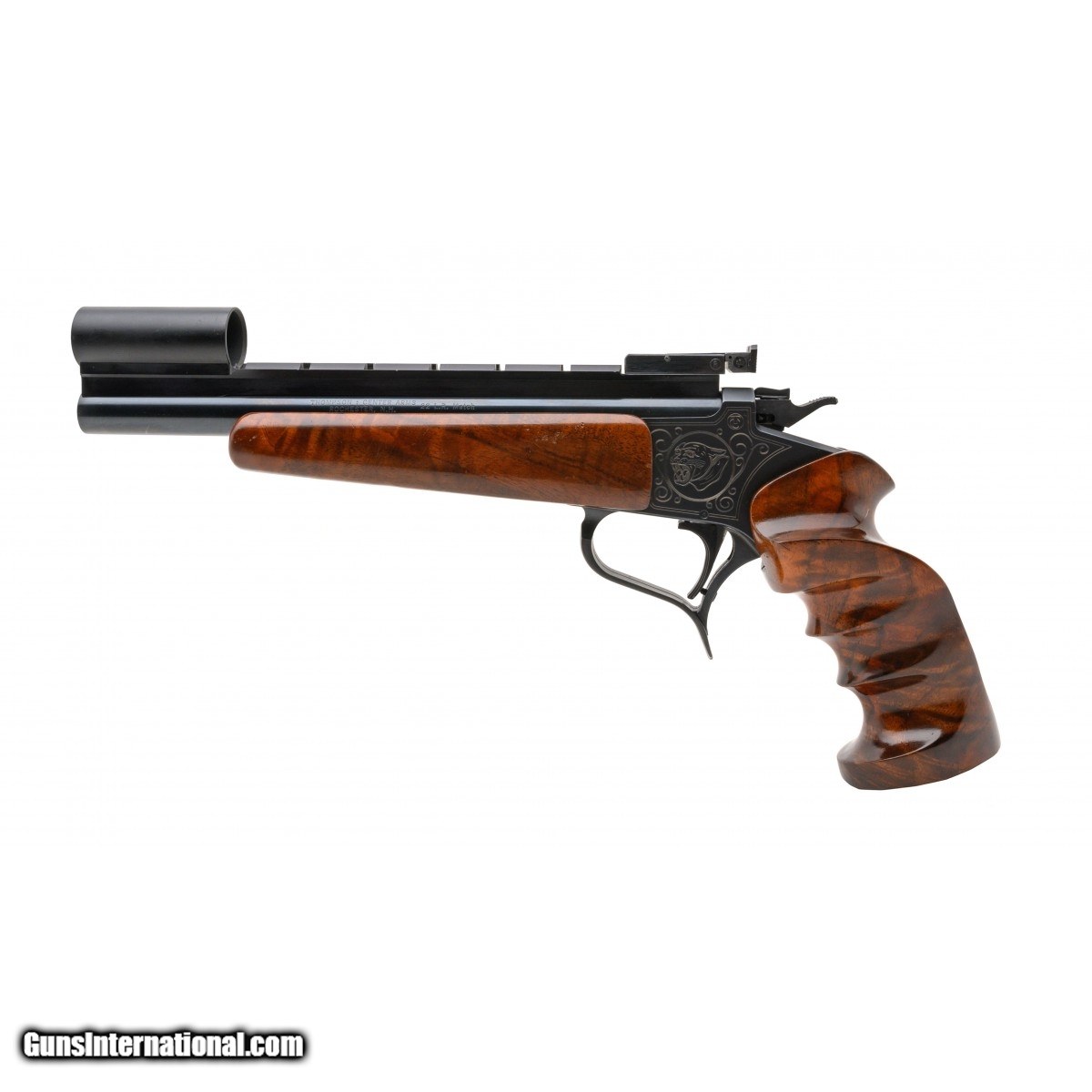 Description: " SN:454043. Made in 1999. .22LR with a 10"" barrel. Bore is in excellent condition. Single shot target pistol. Finish and engraved receiver are in excellent condition. Pistol has hooded front sight, scope mounting rail and custom thumb rest grips. Overall condition is excellent. SOLD |