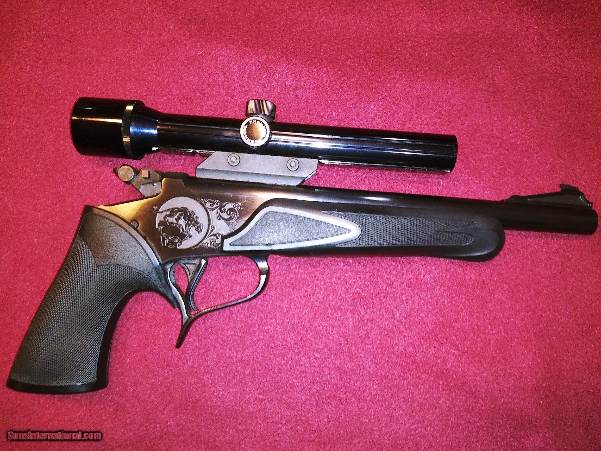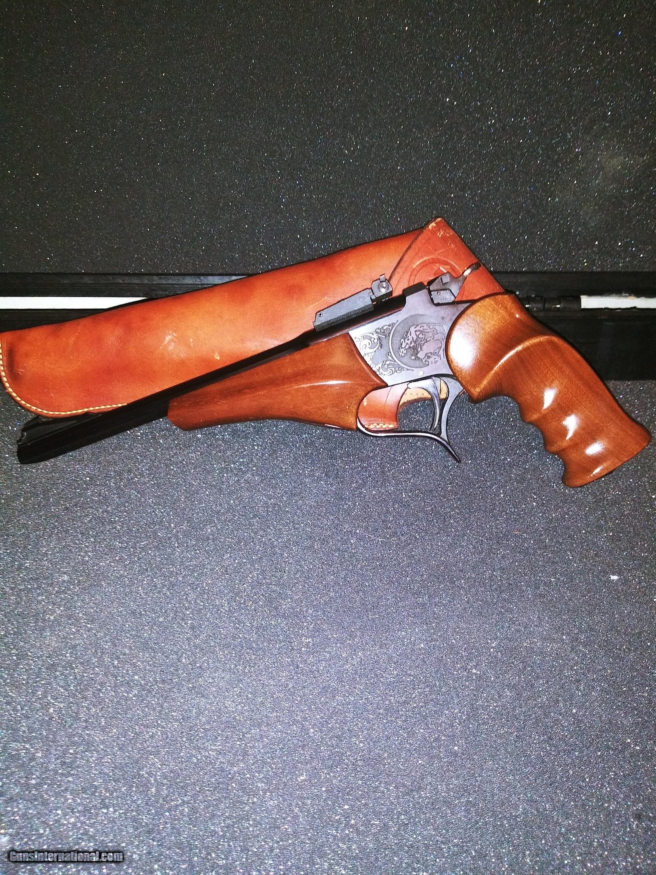 1983 Thompson Center Arms pistol with 6 barrel/caliber options, holster, scope, foregrips, and carry case.