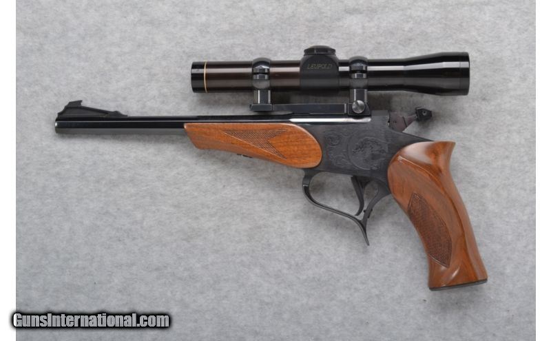 Description: Reciever side are engraved with scroll and mountain lion. SOLD Caliber Info: .30-30 Win. Metal Condition: Very good. Wood Condition: Very good. Bore Condition: Very good. Barrels: 10 inch octogon. Stock: Checkered walnut with metal TC cap. Weight: 50 oz. with scope mounted. Sights: Leupold M8-2X Scope. Ramp blade with red. Extras: With Soft Case Item Location: Springfield, OR |