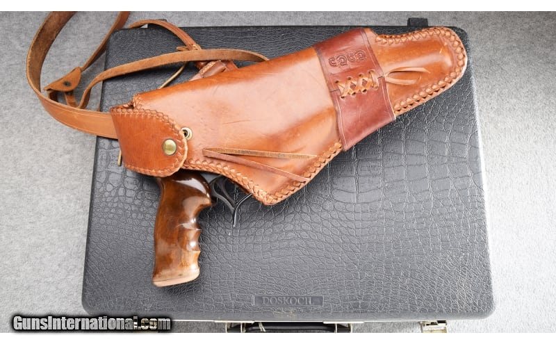 Description: This Thompson Center Contender set remains in excellent overall condition. Wood is solid with a few light use marks and a small area of wear to high gloss finish on bottom grip. T/C grip cap has been nicely replaced with smooth plastic cap. Blue is excellent on all four barrels showing just a few light use marks. No oxidation or pitting is visible. Bores are all excellent! .357 Rem. Max. barrel is factory drilled at front of barrel with Leupold M8-4X with extended E.R. .223 Rem. Barrel is complete with Patridge front sight and Burris 3X scope. .22 Hornet and .45 Colt-410 both have Patridge Front sights with Adjustable Square Notch Rear sights. Gun comes with foam lined Doskocil carry case and hand-crafted heavy-duty leather shoulder holster with 5 round cartridge holder. This set covers all your hunting needs in one! .357 Remington Maximum SOLD Metal Condition: Excellent Wood Condition: Very Good Bore Condition: Excellent Barrels: 10" (All 4 Calibers) Triggers: Factory Fore End: Uncheckered Walnut with Ergonomic Finger Grooves - Uncheckered Walnut Forend Weight: 62 oz. Sights: .357 Rem. Max.- Leupold M8-4X Ext. ER / .223 Rem. - Burris 3X with Patridge Front / .22 Hornet - Patridge Front / .45 Colt - Patridge Front with Adjustable Square Notch Rear Item Location: Wheeling |