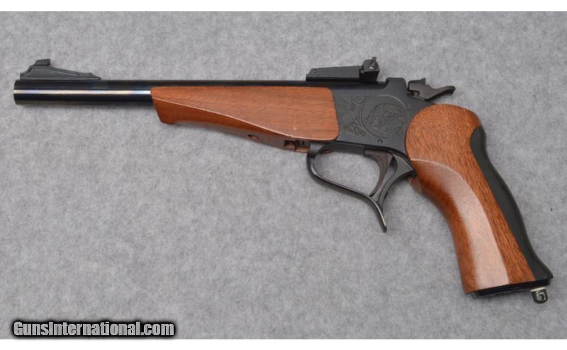 Description: This nice Thompson Center Contender is chambered in .45 Long Colt. The receiver is matte blue and factory engraved with a wildlife scene and some scroll. The barrel is 10¿ round and polished blue. The bore is crisp and clean. This is an excellent condition single shot pistol. SOLD Caliber Info: .45 Colt Chambers: Single shot pistol. Metal Condition: Excellent. Wood Condition: Excellent with some very minor handling marks. Bore Condition: Bright with crisp rifling. Barrels: 10" blued with factory sights. Triggers: Serrated blue trigger. Stock: Smooth walnut grip with black rubber insert. Has a black plastic grip cap. Fore End: Matching walnut fore end. Weight: 44 oz. Sights: Ramped blade front, fully adjustable rear. Item Location: West Chester, OH |
