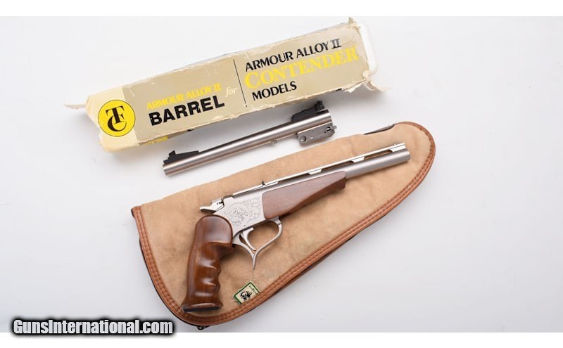 Description: High Condition pre-owned Thompson Center Contender chambered in .45 Long Colt / .410 Bore. Mechanism is crisp. Bore presents excellent; bright. Finish is well-preserved. Includes soft case, and extra barrel chambered in 7mm TC. .45 Colt / 410 Gauge SOLD Metal Condition: Electroless Nickel ~ Silver Alloy II Wood Condition: Walnut Bore Condition: Bright Barrels: 10 Triggers: Single Stage Fore End: Walnut Weight: 46 oz. Sights: Front Bead / Vent Rib Item Location: Buda, TX |