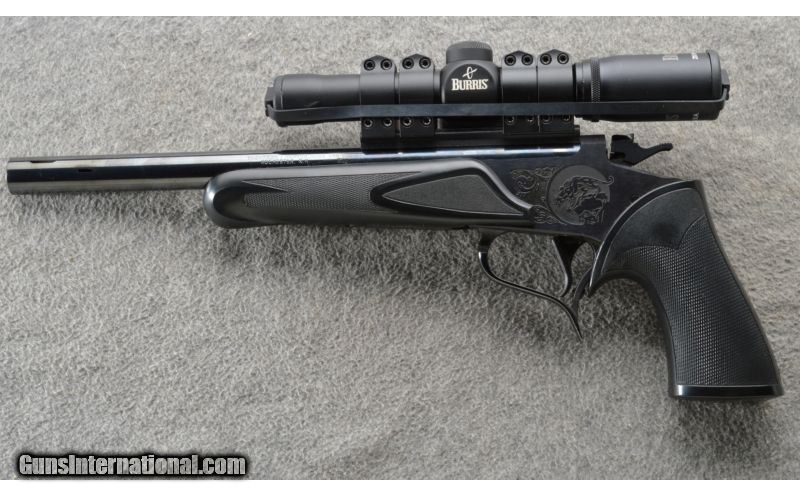 Description: This is a nice clean Thompson Center Contender in the poweful .445 Super Magnum. The engraved frame is new looking and the ported barrel is a bright blue and free from any negative issues. This nice pistol is topped with a Burris 2X handgun scope. SOLD Caliber Info: .445 Super Mag. Chambers: Single shot. Metal Condition: Excellent. Wood Condition: The grips and forearm are excellent. Bore Condition: Bright and shiny. Barrels: 12 Inch ported. Triggers: Single. Stock: Black hard rubber checkered grips. Weight: 4 Lbs 14 Oz as pictured. Sights: Burris 2X handgun scope. Extras: Comes with the scope, rings (4) and scope base. Item Location: Owatonna, MN |