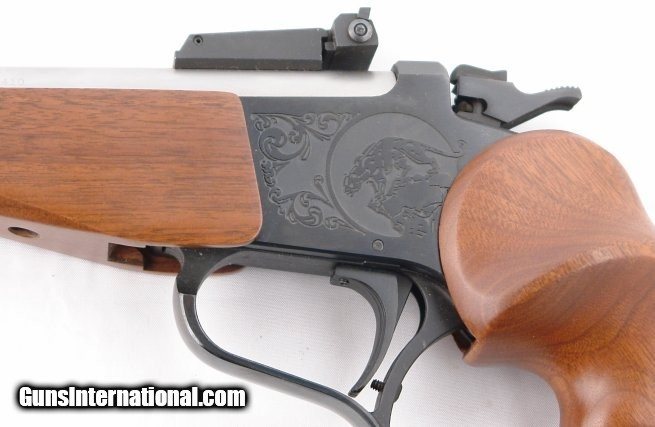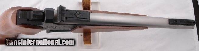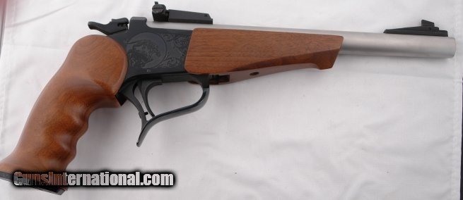 Description: THOMPSON CENTER CONTENDER PISTOL WITH THREE BARRELS, ONE STAINLESS 10" .45 COLT / .410GA, 15" .30-06 SPFD AND 15" .22-250 REM BARREL PISTOL. Serial number "445XXX" rear of hammer. Like new condition with NO signs of use or carry. Factory adj rear sight. Have two other barrels that came with it. 15" blue .22-250Rem with adj. sights and 15" blue .30-06Spfd with same adj sights(have fun shooting that). All are TC barrels and never used. Good deal with all three barrels. SOLD |