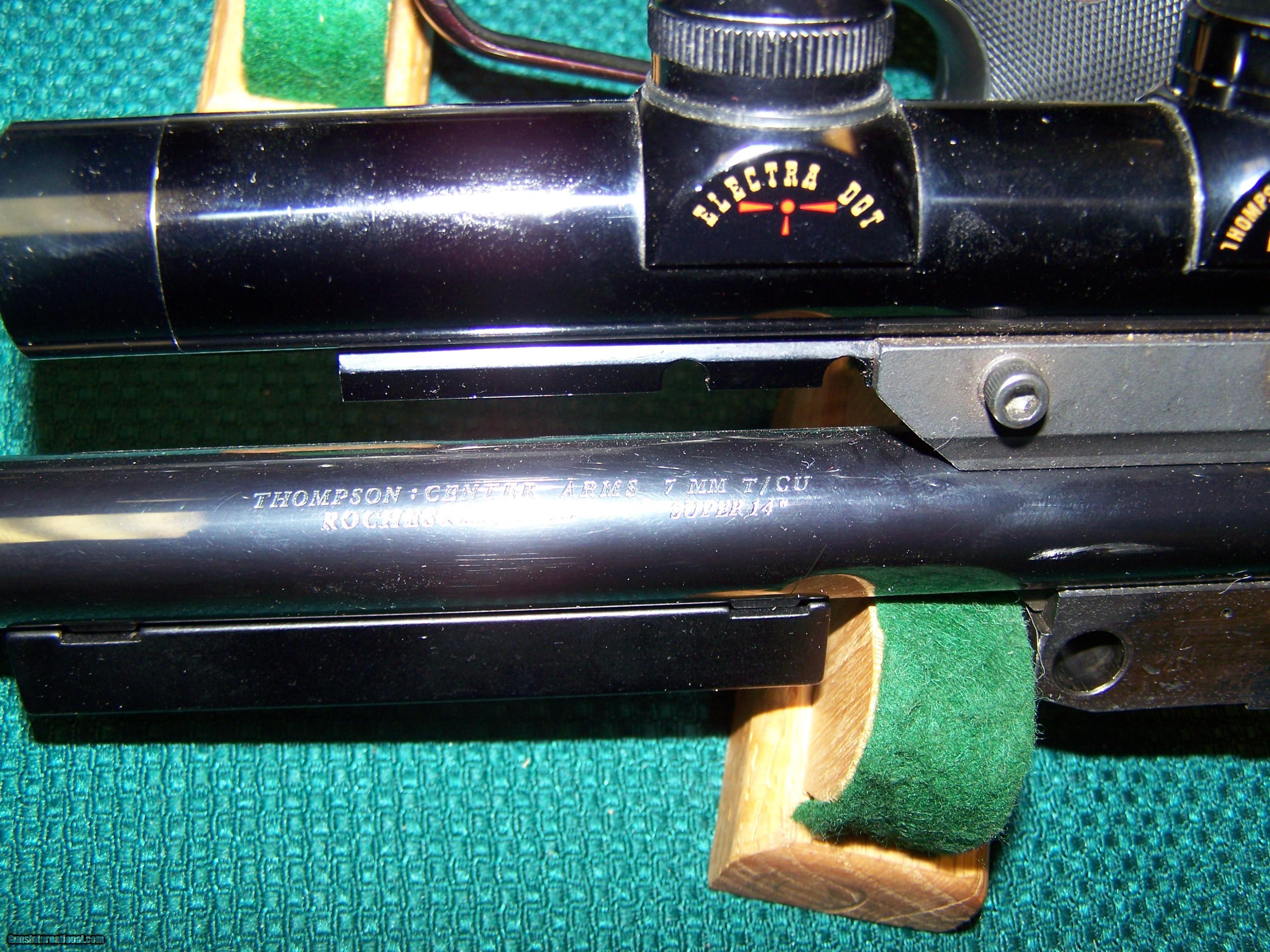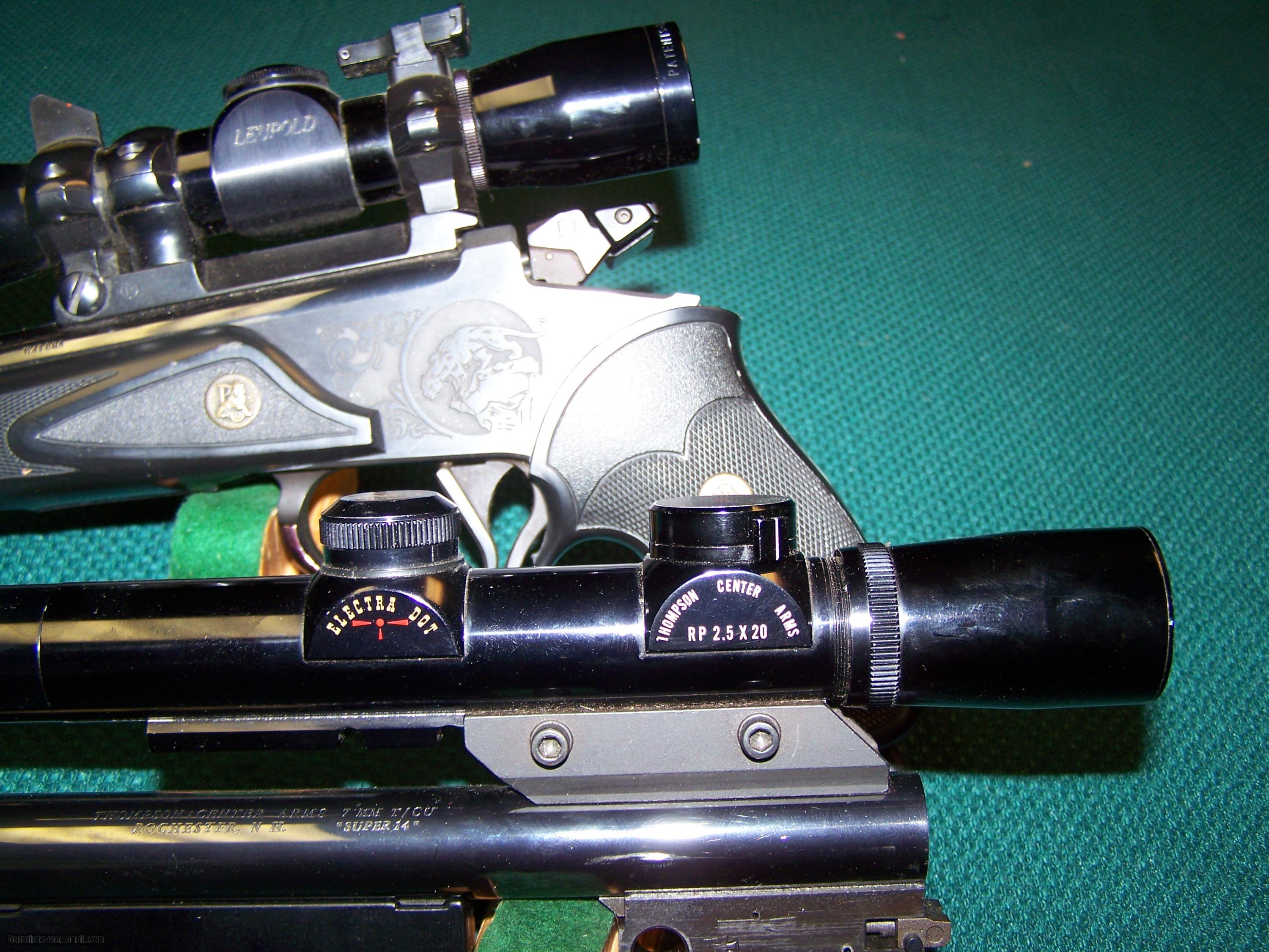Description: Thompson 10" 7x 30 Waters with Leupold 8x 4 extended eye relief scope , including fixed sight. 2nd barrel 14" 7MM TCU with Thompson center RP 2.5 X 20 elctra dot.Both set ups in excellent condition, clear optics and good bores. Questions or comments call Greg 607-865-4370. $ 800.00 shipped SOLD |