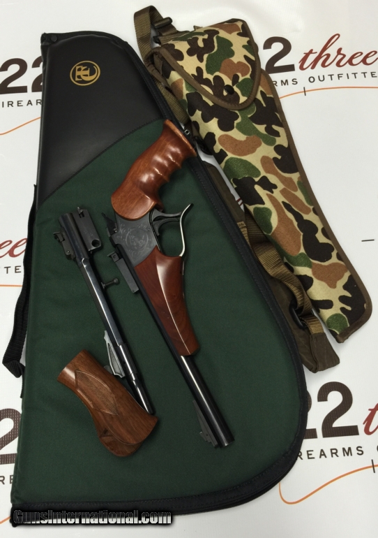 Description: Thompson Contender comes with one 10.5" barrel chambered in 22LR and one 10.5" barrel chambered in 45LC with hot shot barrel extension. Comes with carrying case and shoulder holster. Stocks and grip shows a few dings and light scratches with wear on right and left side of forend from storage and use. Heel of grip has a few scratches. (see photos). SOLD Manufacturer: Thompson Contender Caliber Info: 22LR |