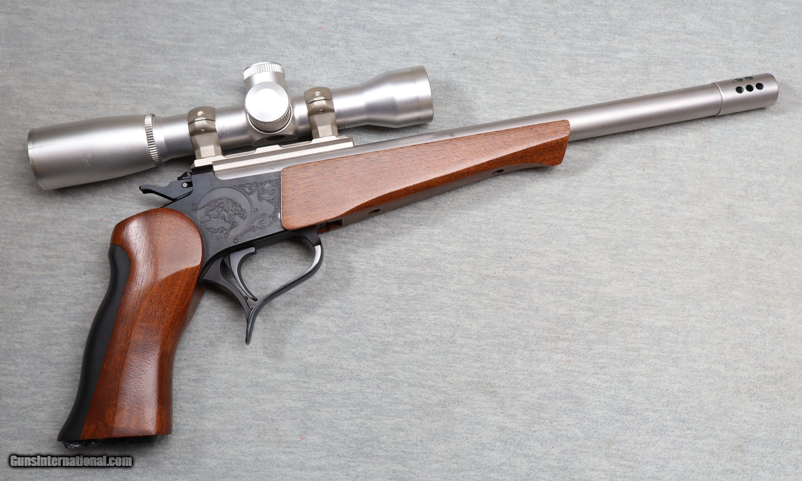 Description: Excellent condition, light finish wear and small scratches. Single shot target & hunting pistol. 14" stainless heavy barrel with muzzle brake, factory black finish metal, and crisp trigger. Smooth hardwood forend and grip with decorative grip cap. None Chambers: Single shot Metal Condition: Excellent Bore Condition: Bright Barrels: 14 Triggers: Factory Butt Pad: Wood grip & forend Sights: Sightron 2x28 scope Item Location: La Vista, NE Price: $849.99 Contact Seller |
