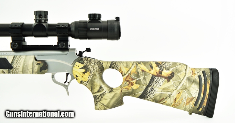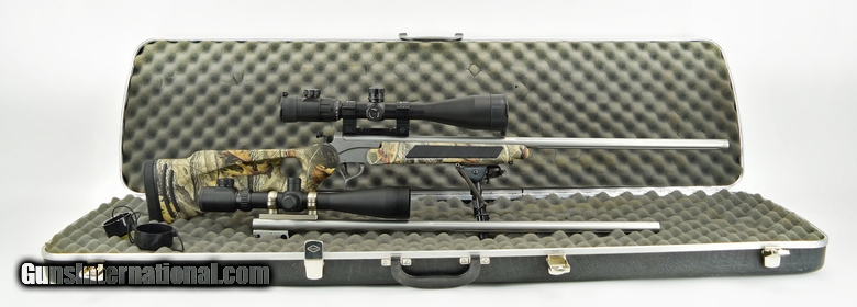 Thompson Center Arms Encore .243 Win caliber rifle. Stainless steel 2-barrel set with a .243 barrel and a .300 Win Magnum barrel, each fluted. Has a camo thumbhole stock with recoil reducer and bipod. The .243 barrel has a Schonfeld 6X24 scope and the .300 barrel has an Explore 4X16 scope. A nice set up in excellent condition with case.