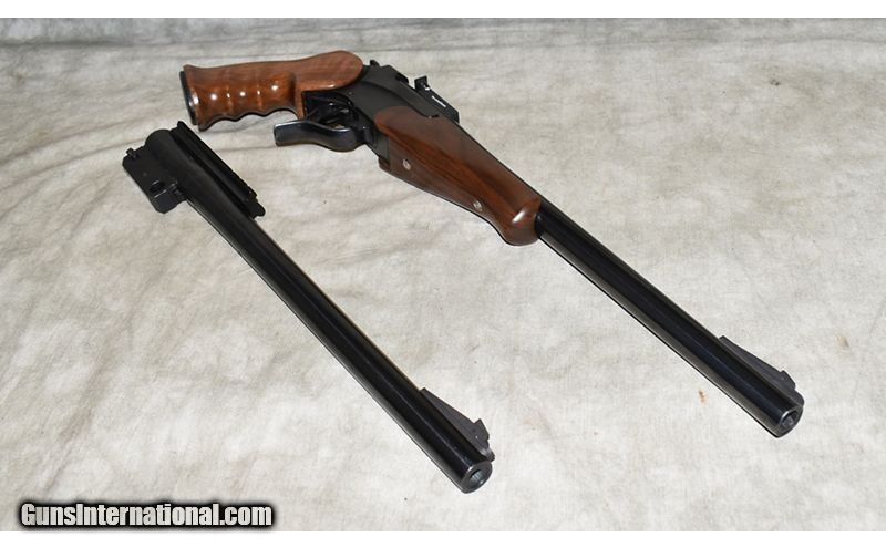 Description: Nice Encore kit with two barrels. This would make a great silhouette target kit of heavy hunting combo. .460 S&W Magnum SOLD Chambers: Single Shot Metal Condition: Very good. There are some minor handling marks. Wood Condition: Very good. Bore Condition: Both barrels are bright and shiny with good rifling. Barrels: Both barrels are 15 inches long Triggers: Factory single action trigger. Butt Pad: Finger groove walnut. Weight: 65 oz. Sights: .460 BBL has post and notch open sights. The 7.62 BBL is set up for scope. Item Location: Rogers |