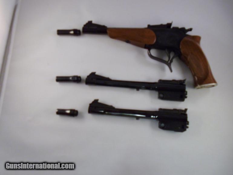 Thompson Center Arms 3 barrel set with receiver. All barrels are octagon. All barrels come with choke extension. Barrels are: 45 Colt 8", .357 Mag 8 1/2", .44 Mag 8 1/4". Measurements do not include chokes. All barrels have adjustable sights. Except for a few minor flaws, gun is in excellent condition. Gun, and barrels, have obviously been fired very little. $45.00 flat rate shipping, insurance and handling. 3% added for credit cards.