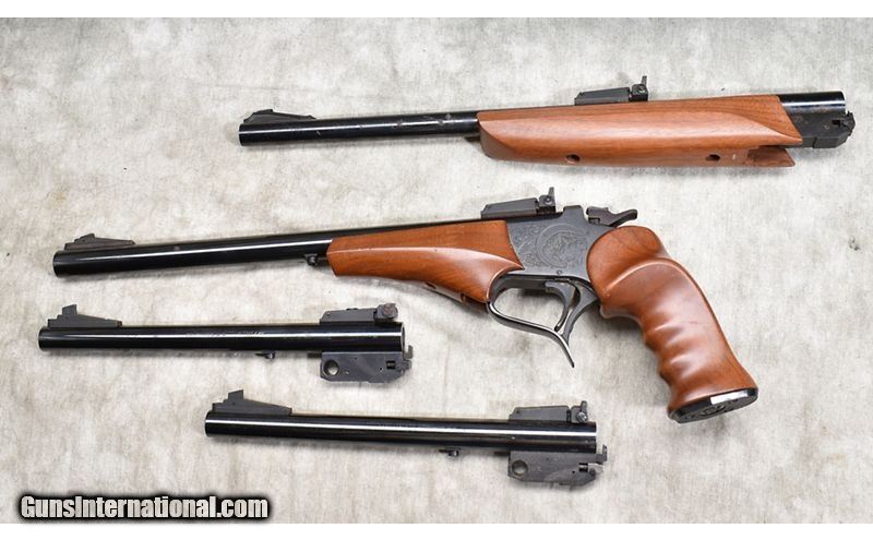 Description: This kit has so too many options to name. It is in good shape for shooting and will make a nice hunting or target gun. .357 Magnum SOLD Chambers: Single shot Metal Condition: Good. The receiver has few defects. The barrels all have varying degrees of rust/pitting. Wood Condition: Good to very good. Bore Condition: "All barrels are shiny with good, sharp rifling. Barrels: ".357 Mag - 10-inch, .45Colt/.410 - 10-inch, .30-30 Win - 14-inch, .45-70 - 16-inch. (4 barrels total) Triggers: Factory trigger. Butt Pad: Factory fingergroove hardwood grip. Pachmayr Presentation composition grip. Weight: 57 oz Sights: All barrels have post and notch "iron" sights. 45-70 barrel is drilled and tapped for scope. Item Location: christiana |