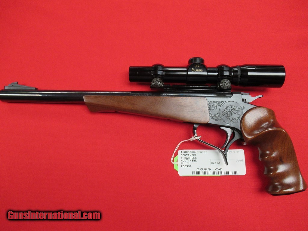 Description: Thompson Center Contender 4bbl Set -- 5" 45/410 BARREL - 10" 357 MAGNUM - 10" 22 LR HEAVY BARREL WITH LEUPOLD M8-2X - 14" 44 MAGUN HEAVY BARREL WITH BURRIS 3X. SOLD |