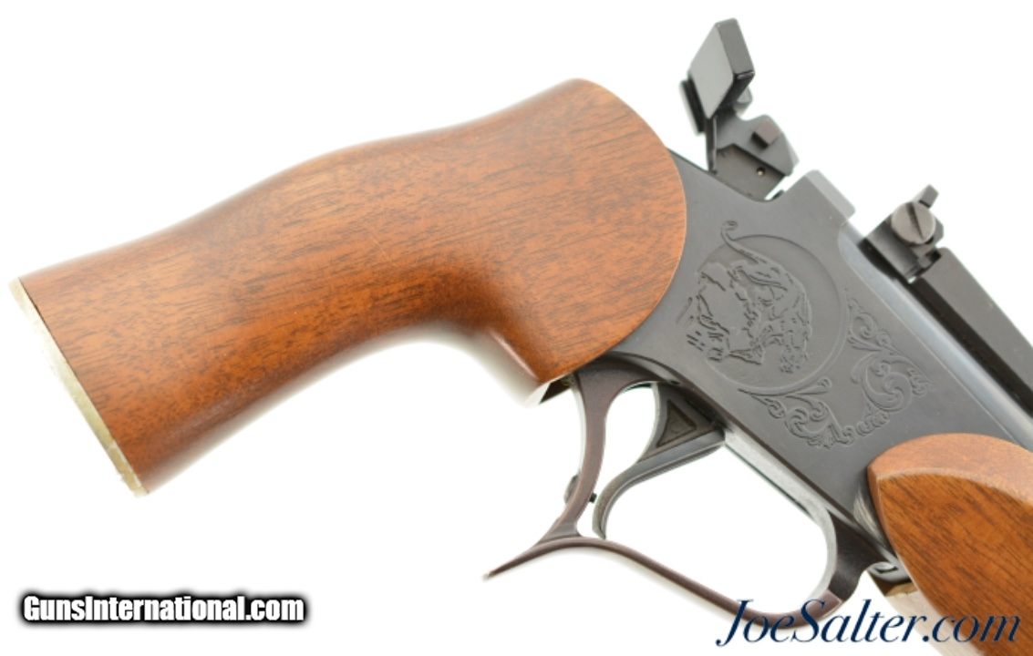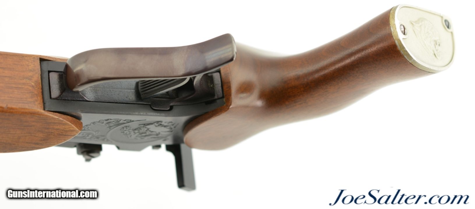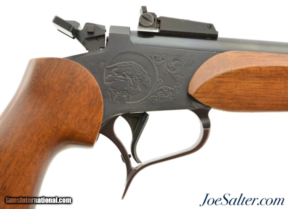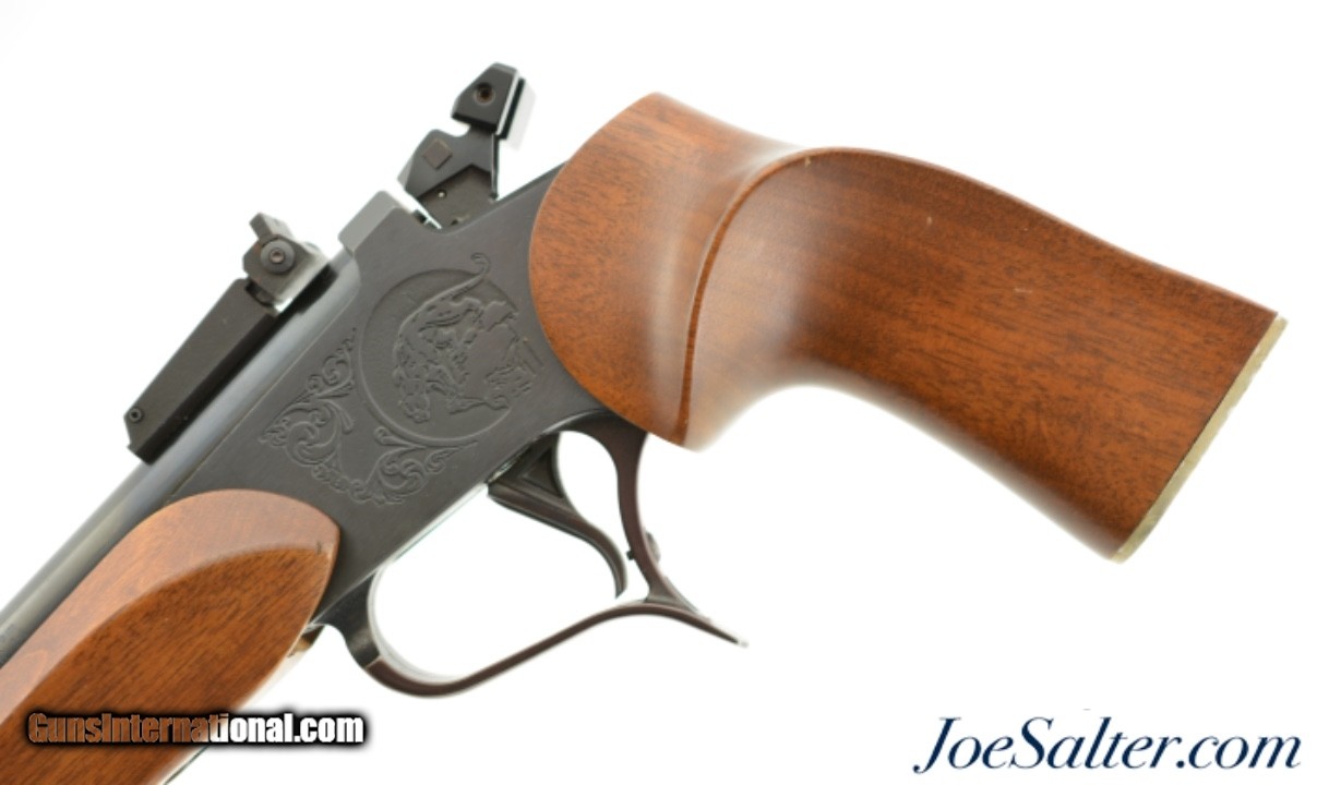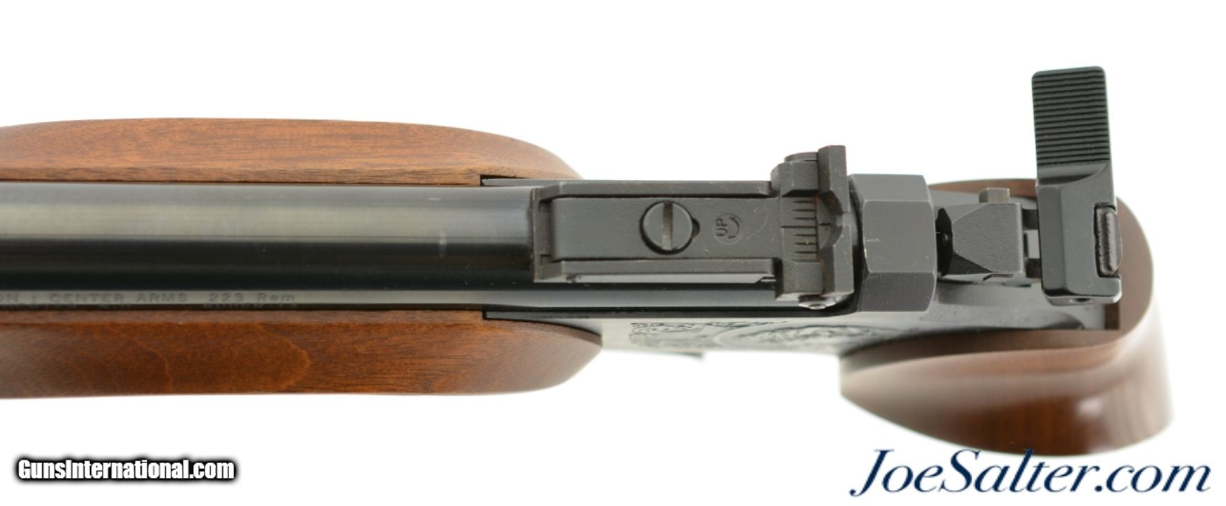 Description: Serial #107650, .223 Remington, 14 inch bull barrel with a bright, excellent bore. This is the Thompson Center Contender manufactured in Rochester, NH and fitted with the Super 14 barrel and wide beavertail forend. In excellent condition The barrel and frame retain virtually all, 96-98% of the original blue finish with only very minor handling and use marks. The right hand walnut grip with TC Cougar medallion and wide beavertail forearm rate excellent. It is equipped with TC adjustable target sights, has the hammer safety button and has a hammer extension. The action is tight and appear to have had very little use. It comes with the original Contender manual and a replacement Pachmayr rubber grip. FFL SOLD |