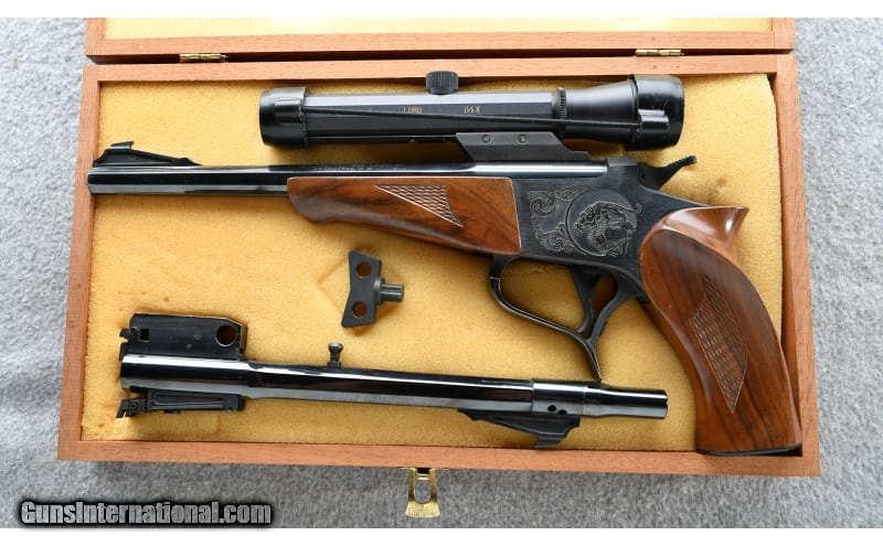Description: The Thompson Center Contender was introduced in 1967. The flexibility of changing barrels and higher accuracy made it a popular handgun with hunters and target shooters. This pistol appears to be a first design variant with push button selector on the hammer for rimfire or center fire cartridges. .222 Remington SOLD Chambers: .222 Remington and .357 S&W Magnum Metal Condition: "Very good, Wood Condition: Very good Bore Condition: Bright and sharp Barrels: ".222 = 10"", .357 = 8"" with Hot Shot choke Triggers: Single Weight: 50 Oz. Sights: .222 has a fixed blade front sight and is fitted with a Thompson Center 1.5X E.E.R. Scope. The .357 has a fixed blade front and adjustable leaf rear Item Location: Grand Junction, CO |