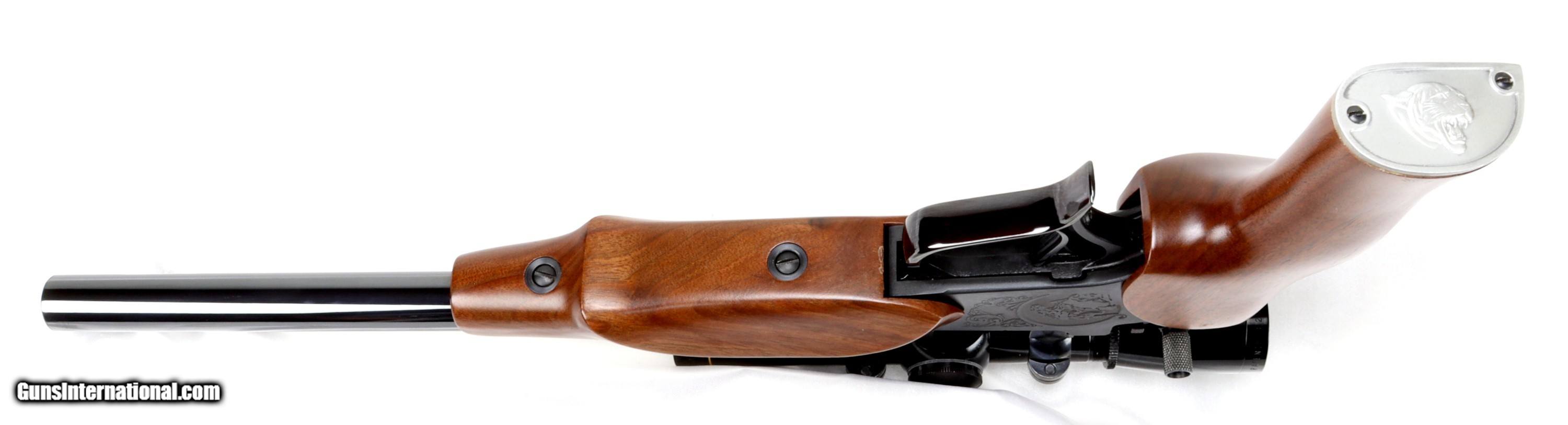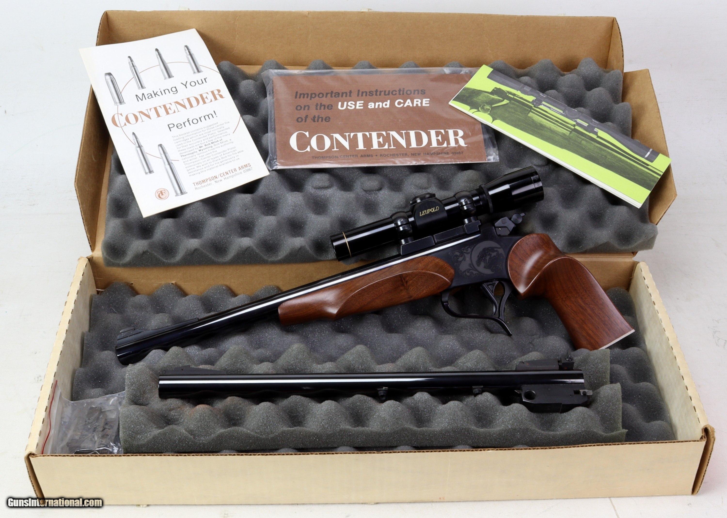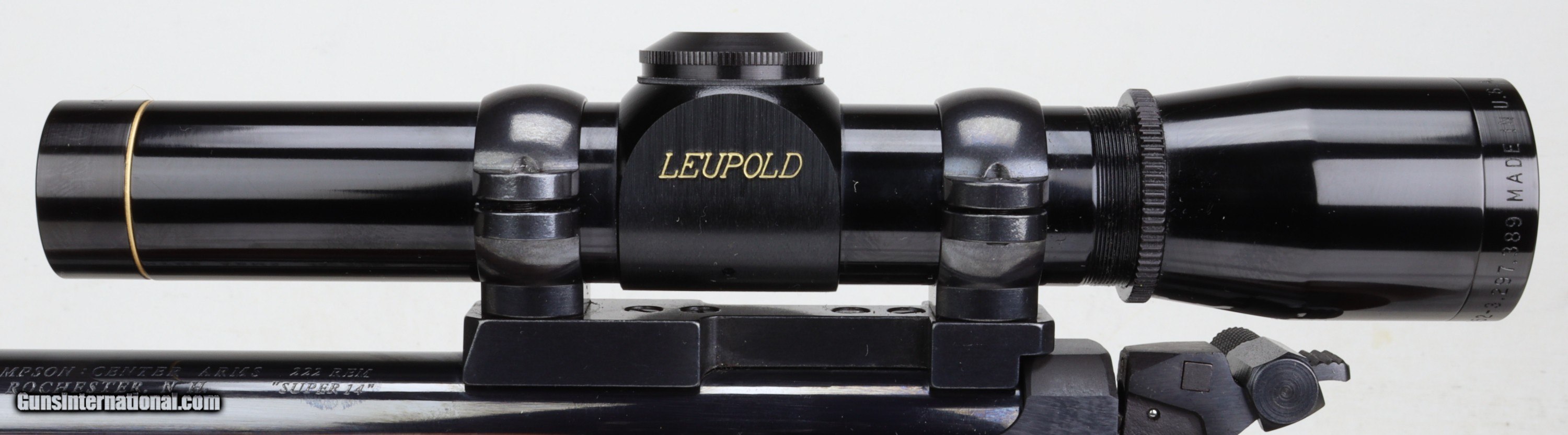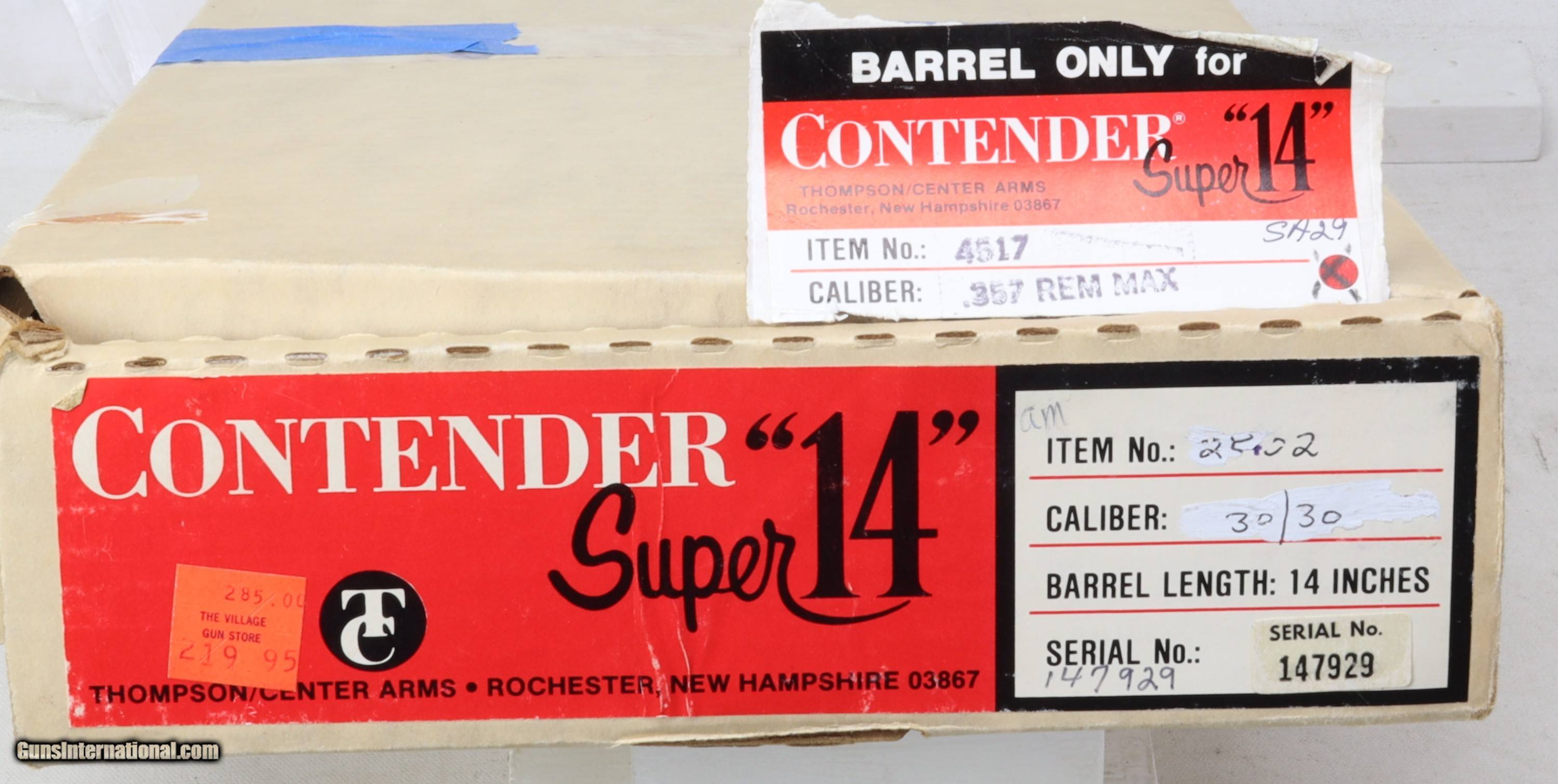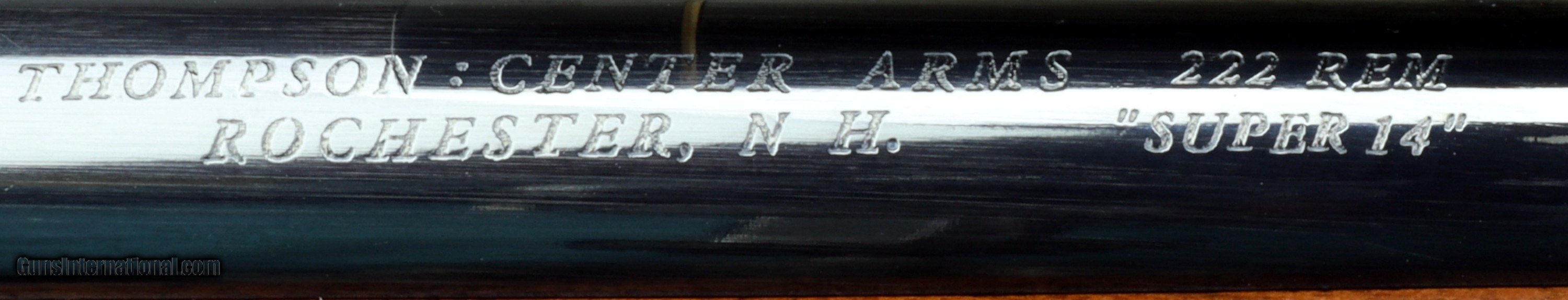 Description: THOMPSON CENTER SUPER 14, 222 REM, 14" Barrel, NIB, Leupold M8 Extended Eye Relief Scope W/Leupold Rings & Bases. Trigger Pull: 3lbs, 9ozs. Gun is Very Tight, Unfired, Comes with Second Barrel, .357 Remington Max, W/Rear Sight. MFG: 1979. Comes with Second 14" , Barrel Ships to Lower 48, w/Insurance: $40.00 Sold to NC Buyer Pending Receipt of funds. SOLD |