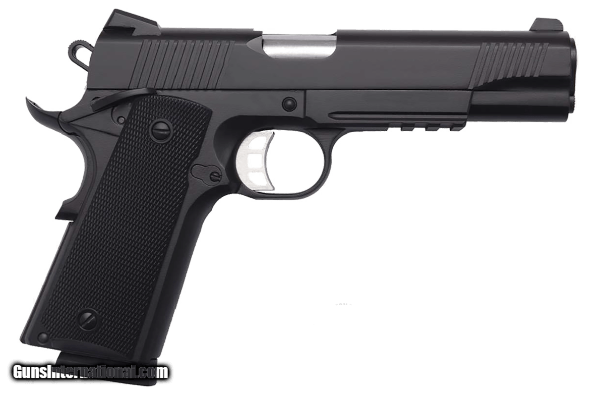 Description: Guns Listing ID: 576292 The 1911-B is and upgraded 1911 in 9mm with various features. It features 70 series internals, a hammer forged stainless steel barrel, Novak style dot sights, a flared ejection port, and a black cerakote finish. It also features and extended beavertail style grip safety, enhanced trigger, extended ambidextrous thumb safety, and beveled magazine well. Includes two 9 round magazine, mounting rail, and cleaning kit. SOLD Manufacturer: TISAS Model: 1911 DUTY Caliber Info: 9MM Condition: new Barrels: 5" barrel Finish: BLACK |