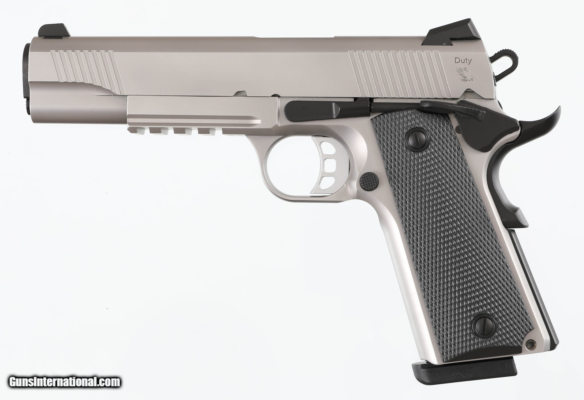 Description: Guns Listing ID: 913887 MAKE - TISAS MODEL - 1911 DUTY SS45R FINISH - STAINLESS STEEL BARREL - 5\" CALIBER - 45 ACP CAPACITY - 8 GRIPS - PLASTIC CONDITION - EXCELLENT FEATURES - COMES WITH ORIGINAL BOX, PAPERS, LOCK, & TOOLS SOLD Manufacturer: TISAS Model: 1911 SS45R STAINLESS STEEL W/ RAIL, BOX & PAPERS Caliber Info: .45 ACP Condition: Used - Non-Certified Barrels: 5 BARREL Finish: STAINLESS STEEL |