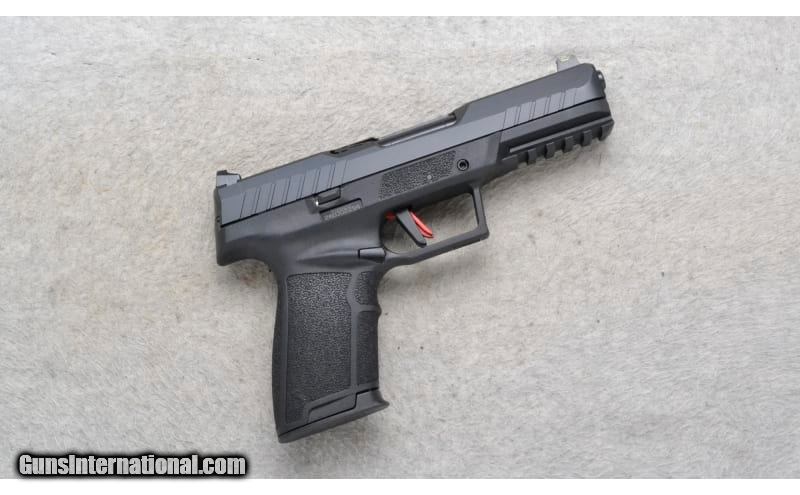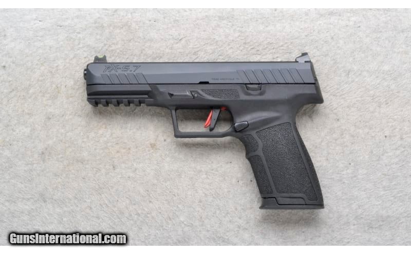 Description: This Tisas Model PX-5.7 is a right hand semi-auto pistol in 5.7x28mm Cal. It has a 5 inch barrel with a front and rear serrated slide. A green high visibility front sight and a notch rear sight. The grip is a textured black polymer with finger groove. It has a lower accessory rail. 5.7X28mm SOLD Chambers: 20 round magazine. Metal Condition: Excellent. Bore Condition: Excellent. Barrels: 5 inch barrel with a front and rear serrated slide. Weight: 30 Oz. Sights: Raised green high visibility front. Notch rear. Item Location: Richfield, WI |