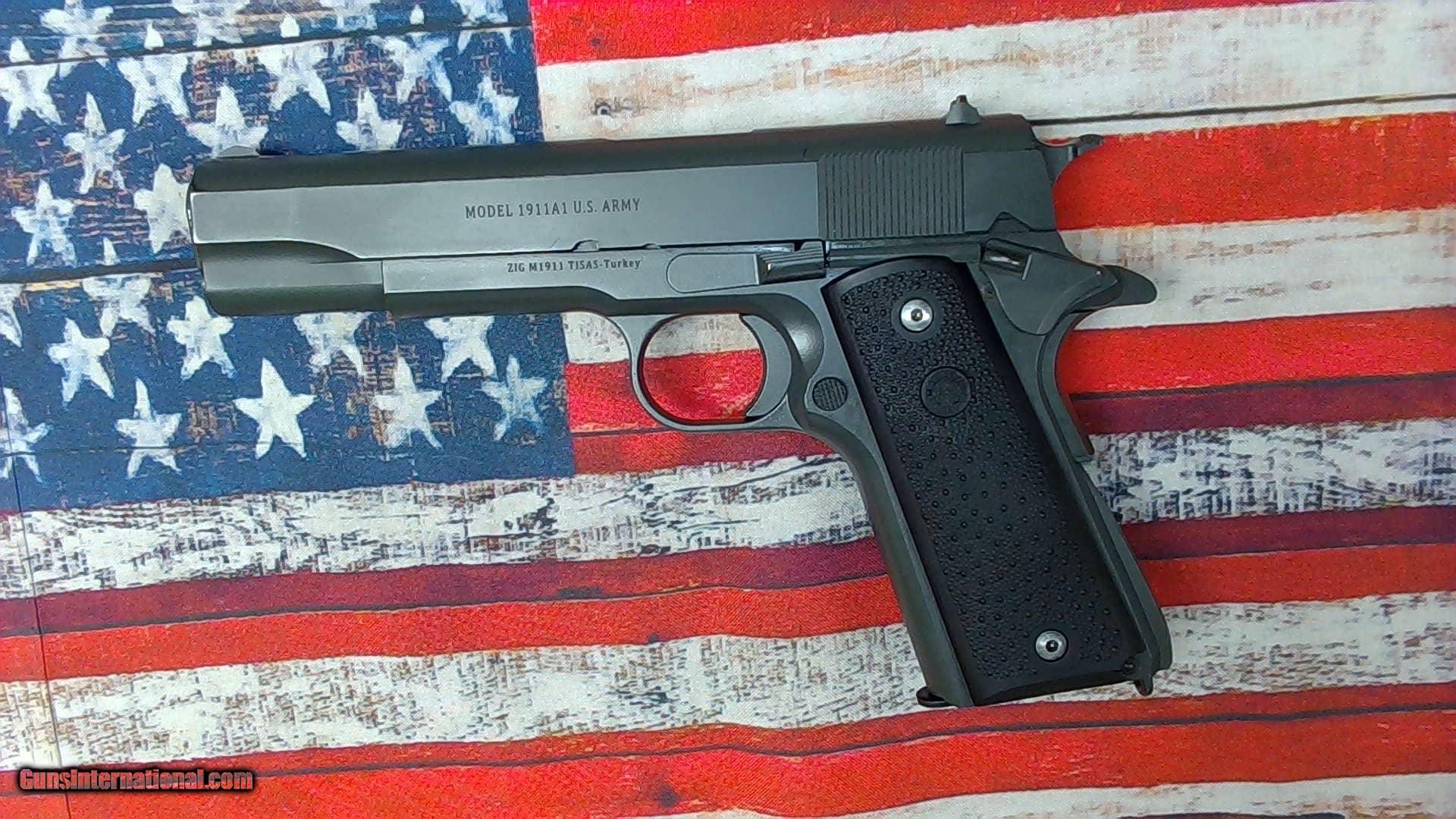 Description: Guns Listing ID: 606069 ****This item is preowned in good condition. Slight holster wear. Includes 1-7rd magazine and Hogue custom grips,.**** The 1911 A1 US Army is a re-production of the US Military‚‚s service pistol in 45ACP. It features 70 series internals, a hammer forged barrel, durable military finish. Includes is 1-7rd magazine SOLD Manufacturer: TISAS Model: ZIG M1911 Caliber Info: 45 ACP Condition: Used - Non-Certified Barrels: 5 BARREL Finish: GREY & BLACK |