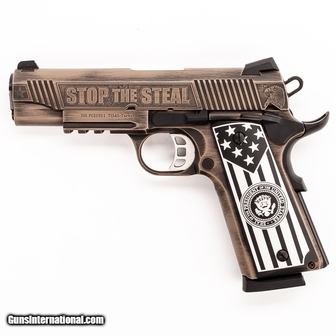 Description: Guns Listing ID: 382657 For sale is a limited-edition Tisas Zig PCS 1911 "Stop the Steal"1911. This is a great addition to the collection. 1-8 round magazine, the original box, manual, and an extra set of black grips are included. SOLD Manufacturer: TISAS Model: ZIG PCS1911 "TRUMP 2020 Caliber Info: .45 ACP Condition: Used - Certified Barrels: 4.2 BARREL Finish: FDE |