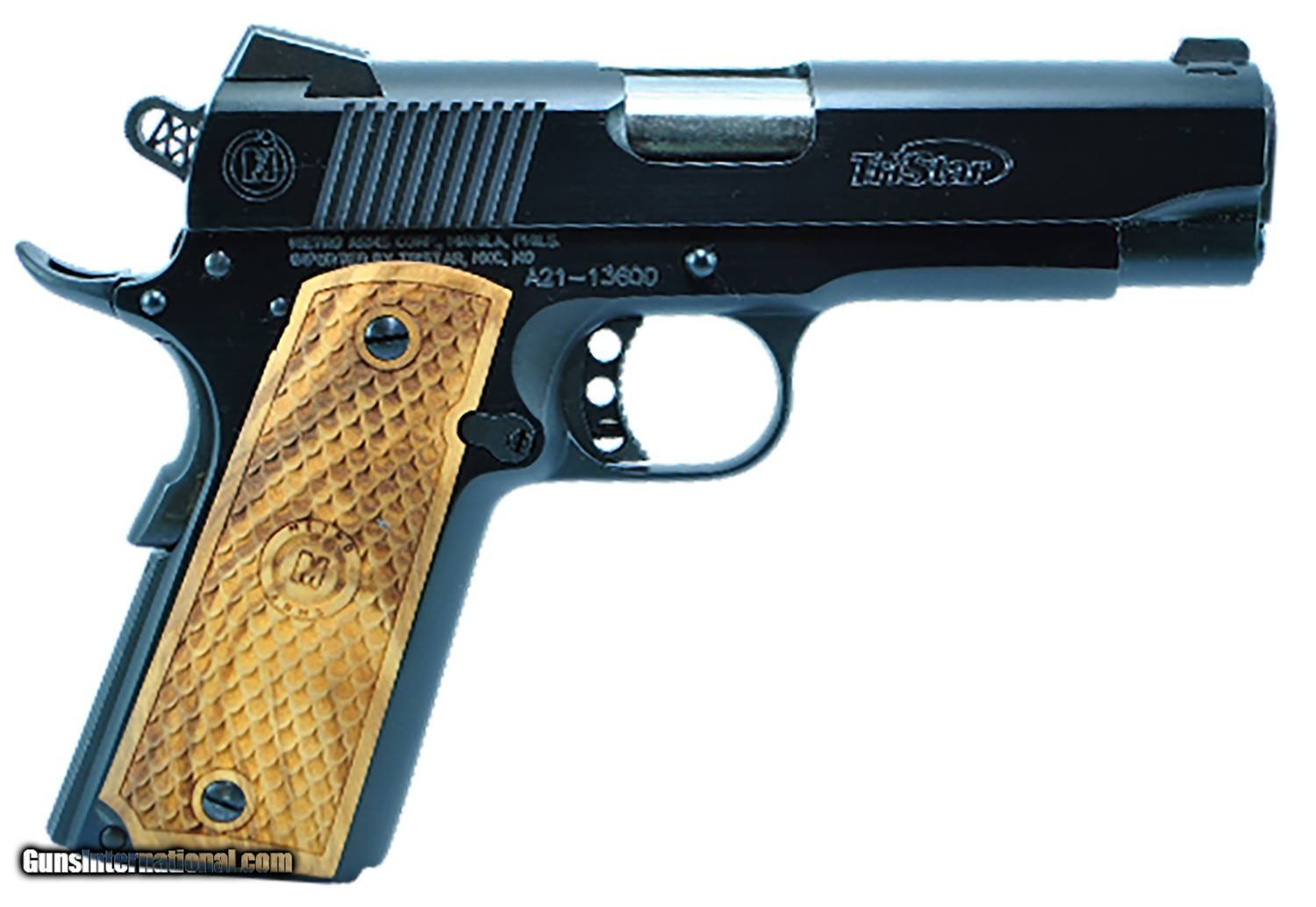 Description: TriStar 85620 American Classic Commander 1911 45 ACP 8+1, 4.25" Stainless Steel Barrel, Blued Serrated Steel Slide, Blued Steel Frame w/Beavertail, Wood Grip Grip ON ITS BEST PRICE! BUY NOW!! The TriStar American Classic II 1911 SAO features a forged steel slide; Series 70 style SA trigger; grip and thumb safety; front & rear sights and custom hardwood grips with logo. Includes a magazine, case gunlock, cleaning kit and owners manual.
